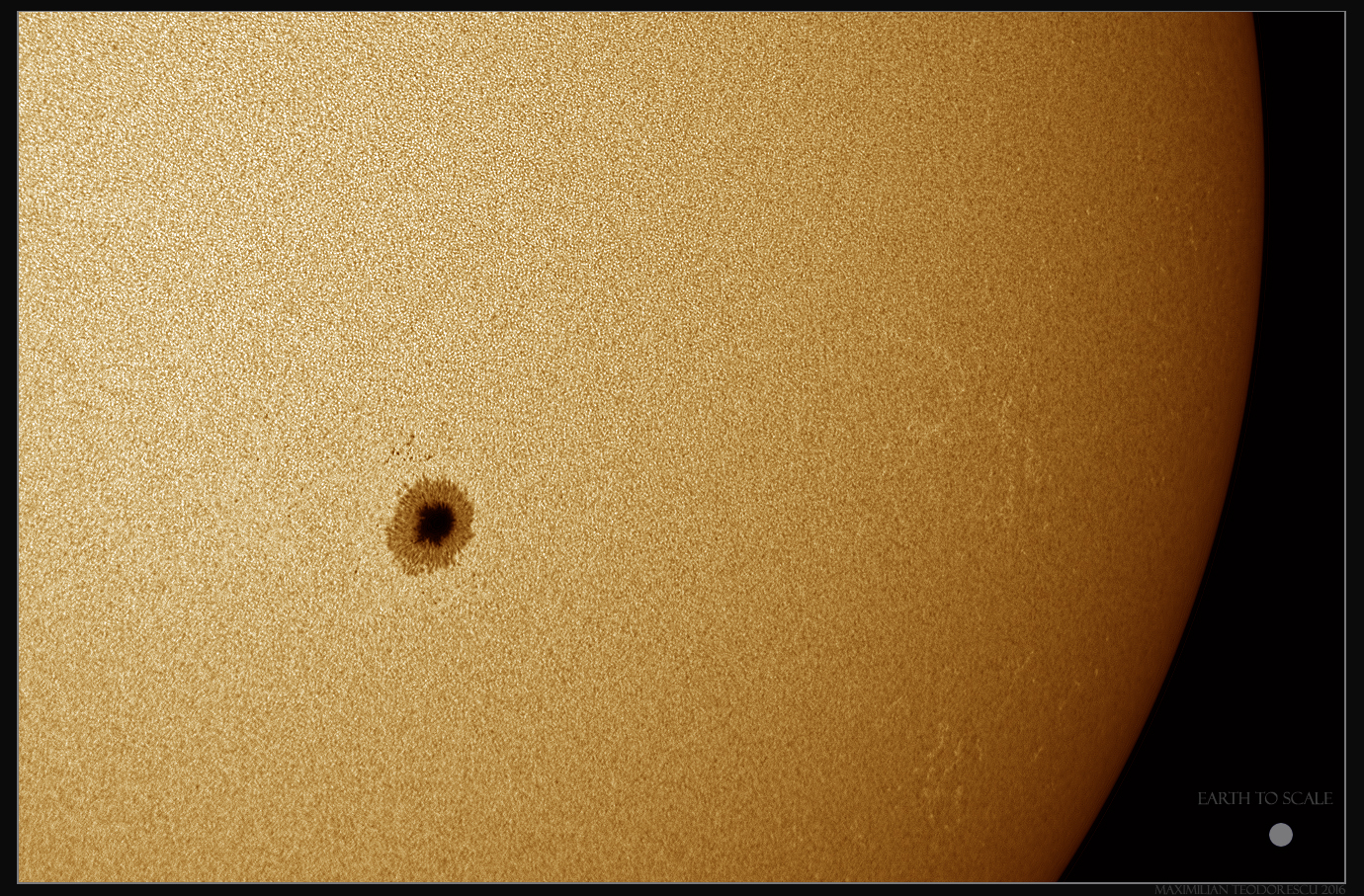 The shot was acquired using a filtered 8 inch homemade Newtonian and ASI 174MM camera with a Ha (30nm bandwidth) filter (for contrast), under poor seeing conditions. 500frames were stacked out of 7000. Note the circle showing the size of Earth for comparison.