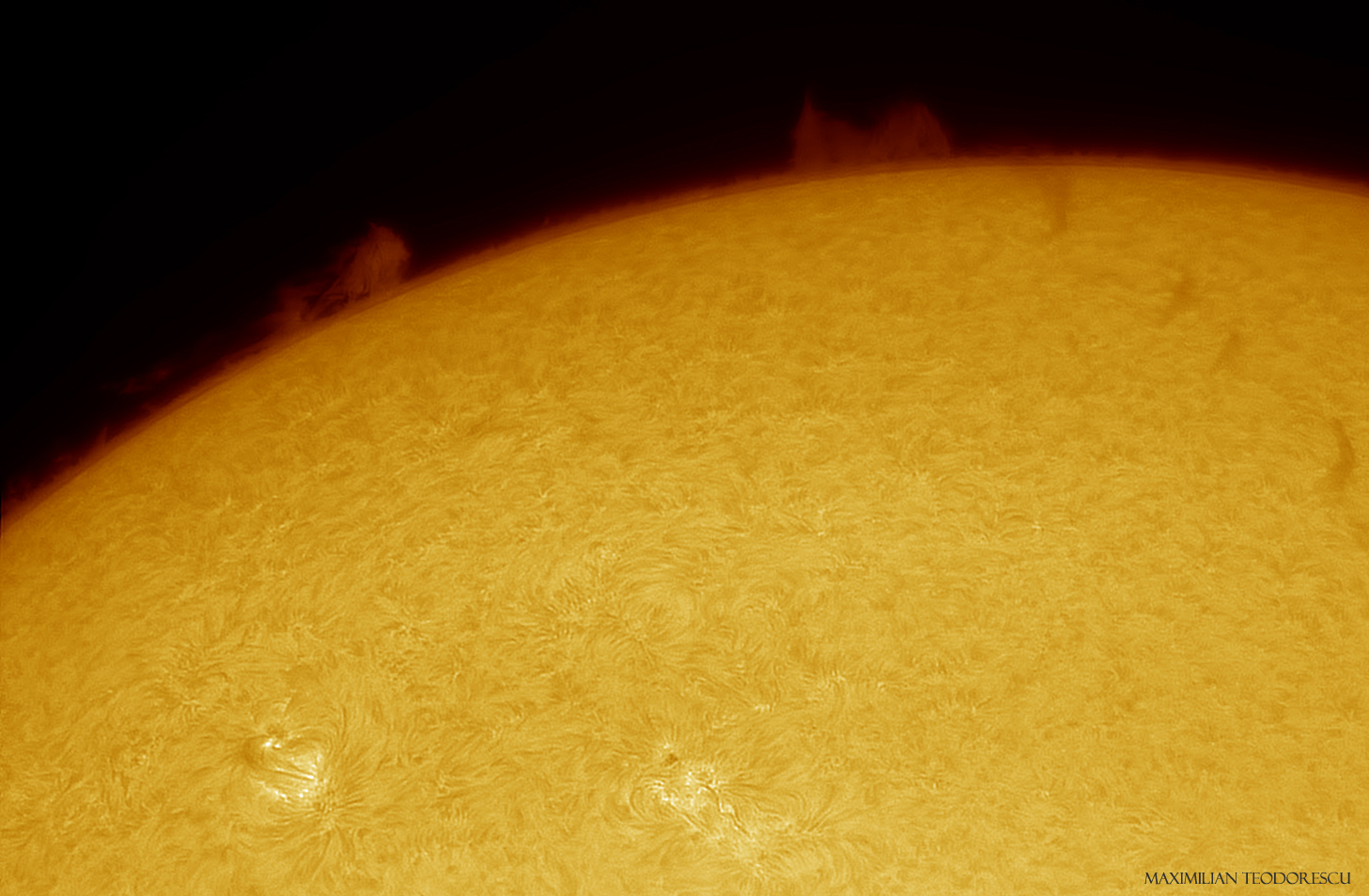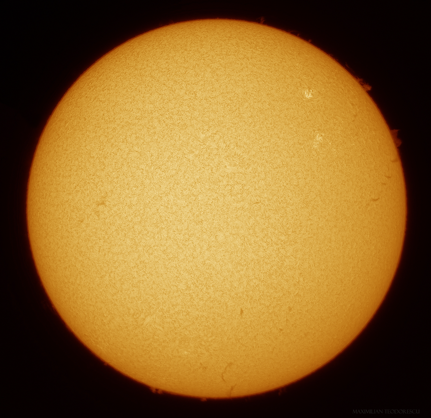 Following is a full-disk image, with added color for effect; this is close to what the Sun looked through the eyepiece (well, the actual view was a bit more red):