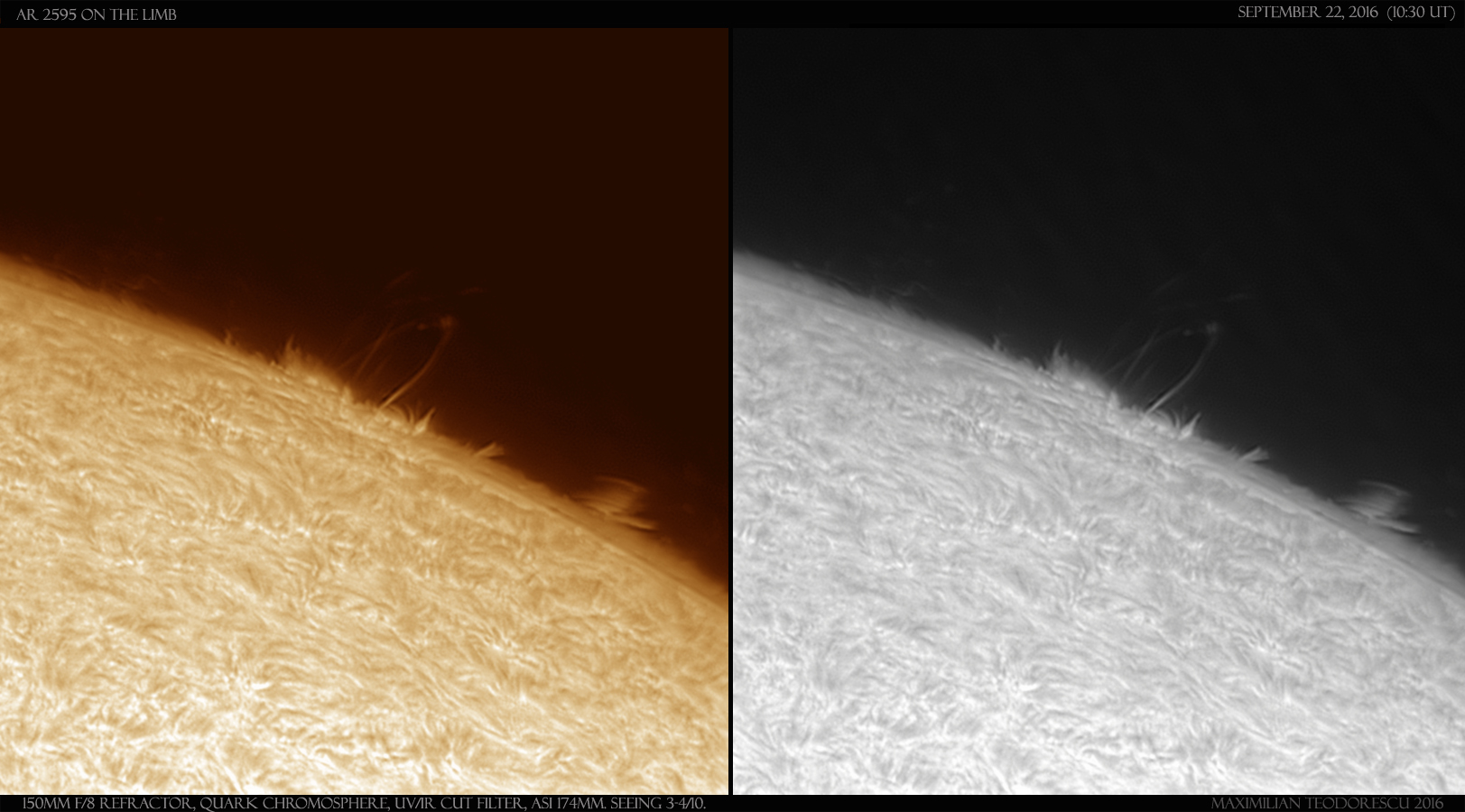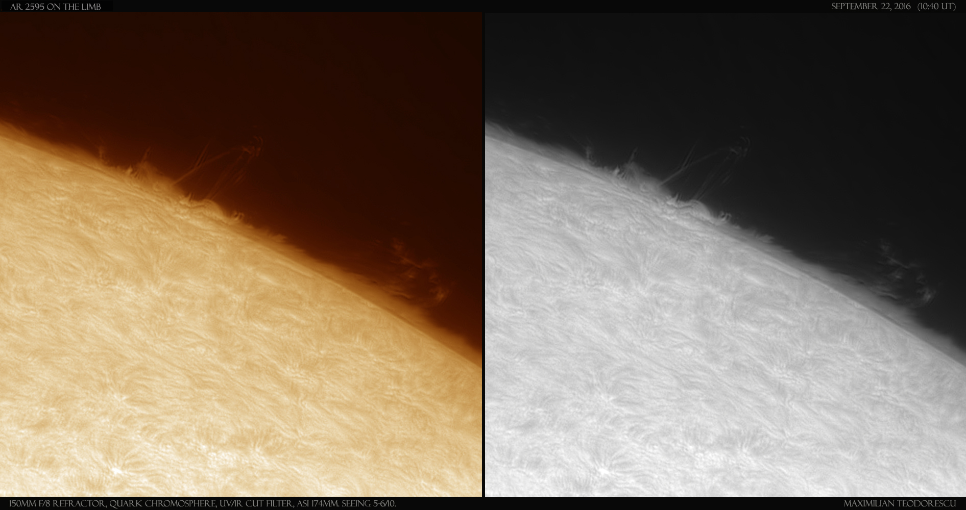 I did however managed to get a few glimpses of the departing active region named AR2595. The region was right on the limb, so a lot of activity was observable.