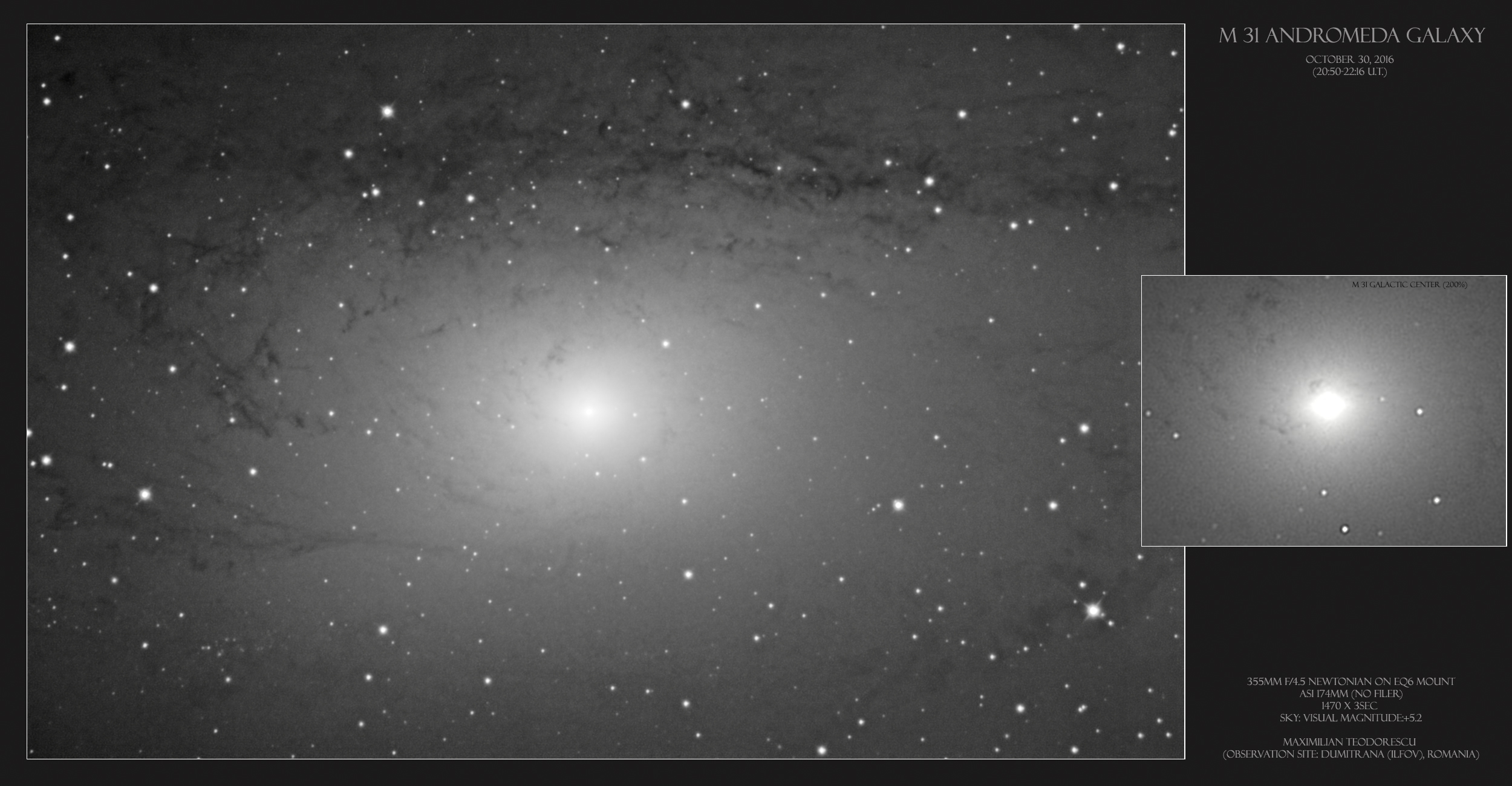 Another “fast-frame” deep sky imaging session. This time the subject was the central part of M 31, the Andromeda Galaxy. There is plenty of dust visible around the image.