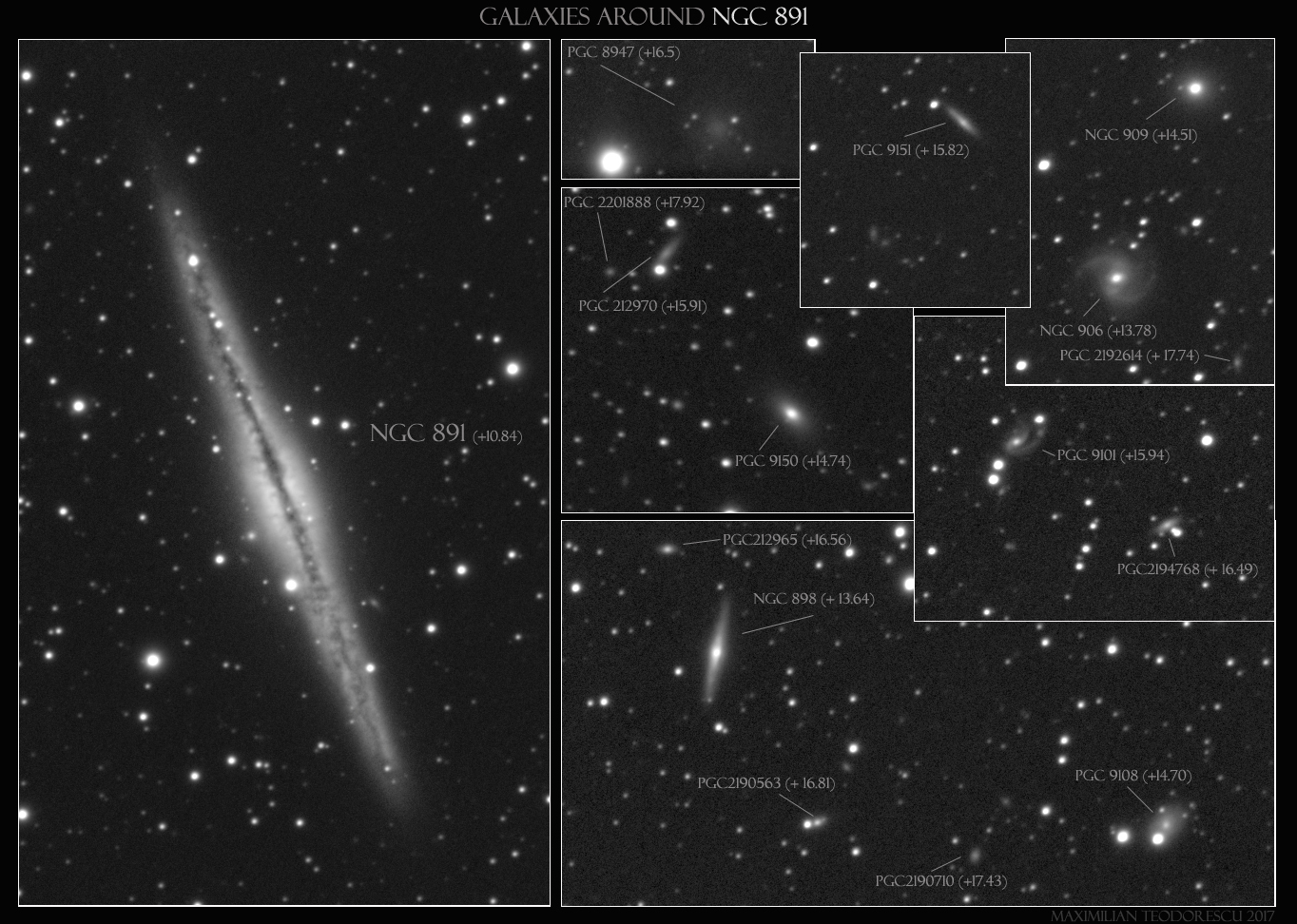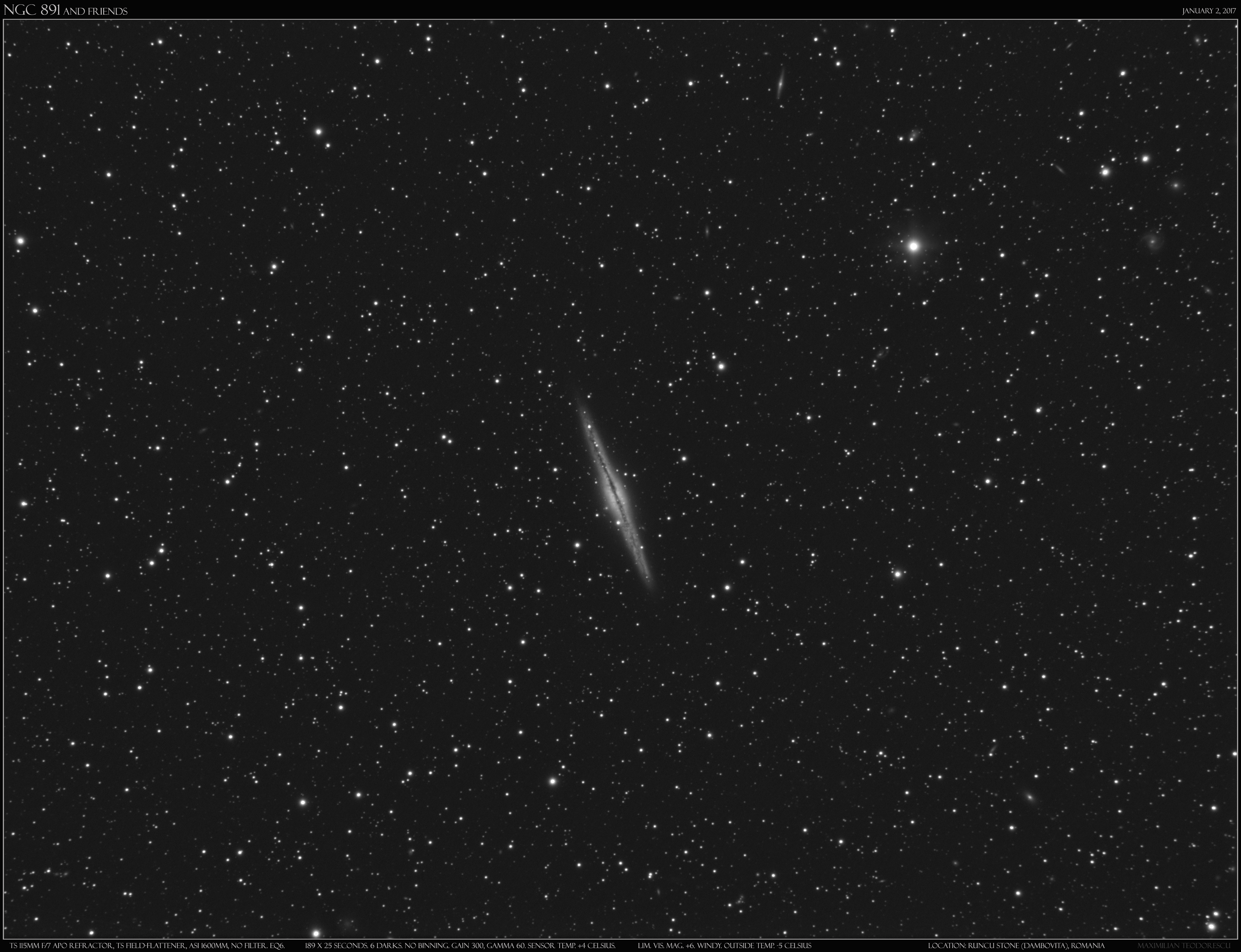 The interesting fact about the following image is that not only NGC891 is well visible, but many more faint galaxies are imaged all around the frame. Some go as faint as magnitude +18, some perhaps fainter.