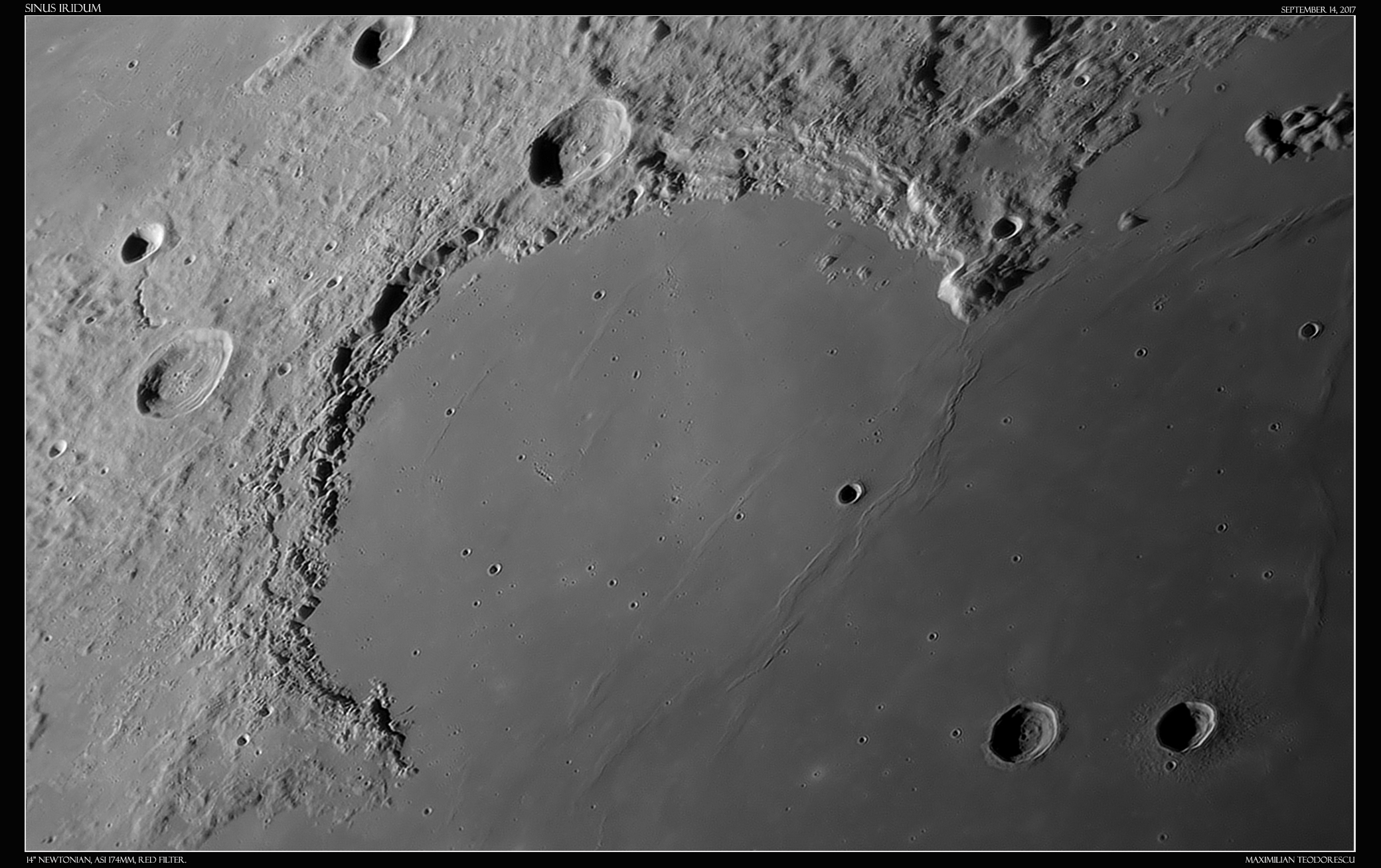 Sinus Iridum with a large number of small craters on its floor. There are also a couple of submerged craters in the image. Can you spot them?