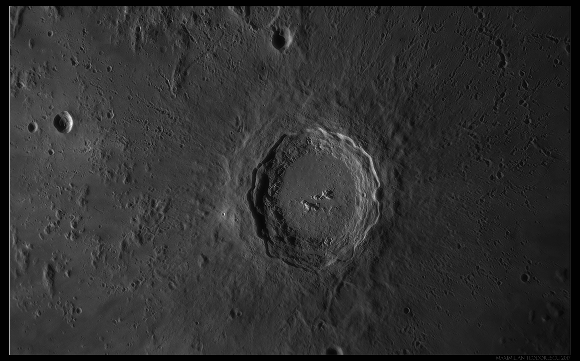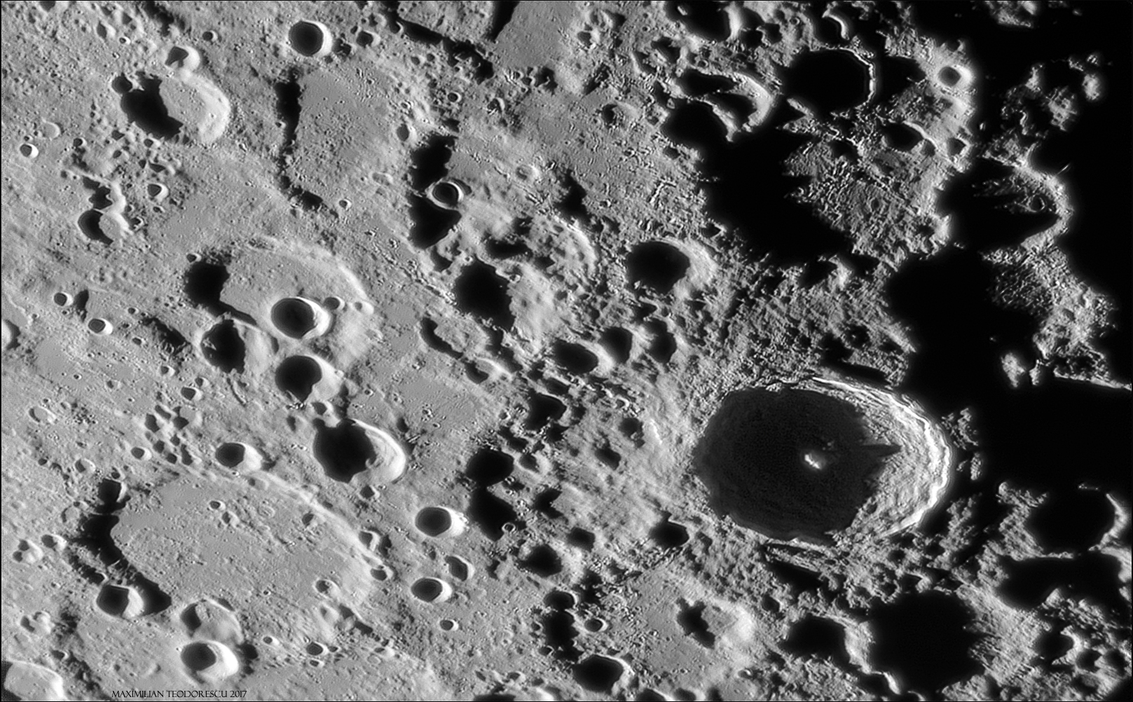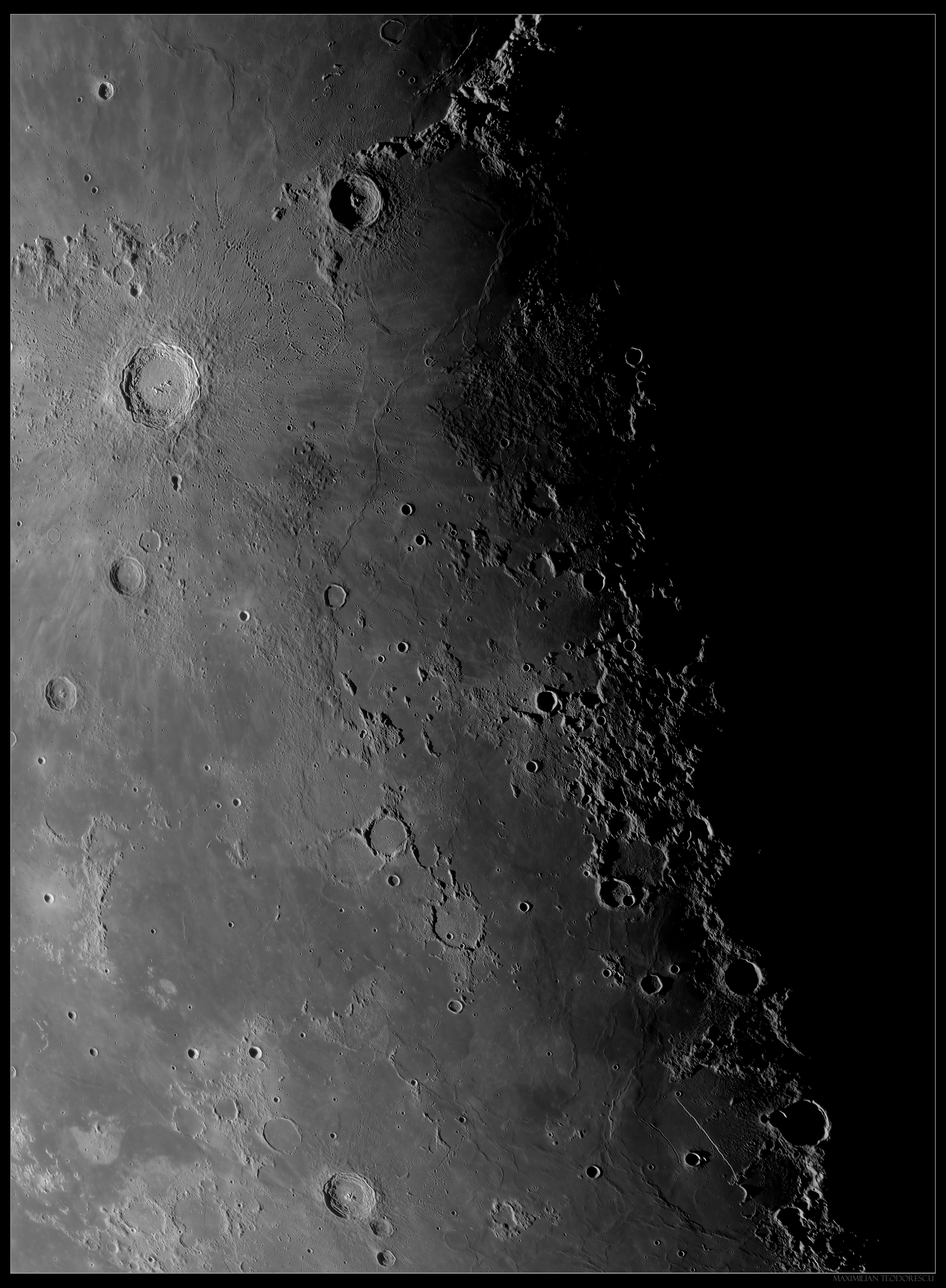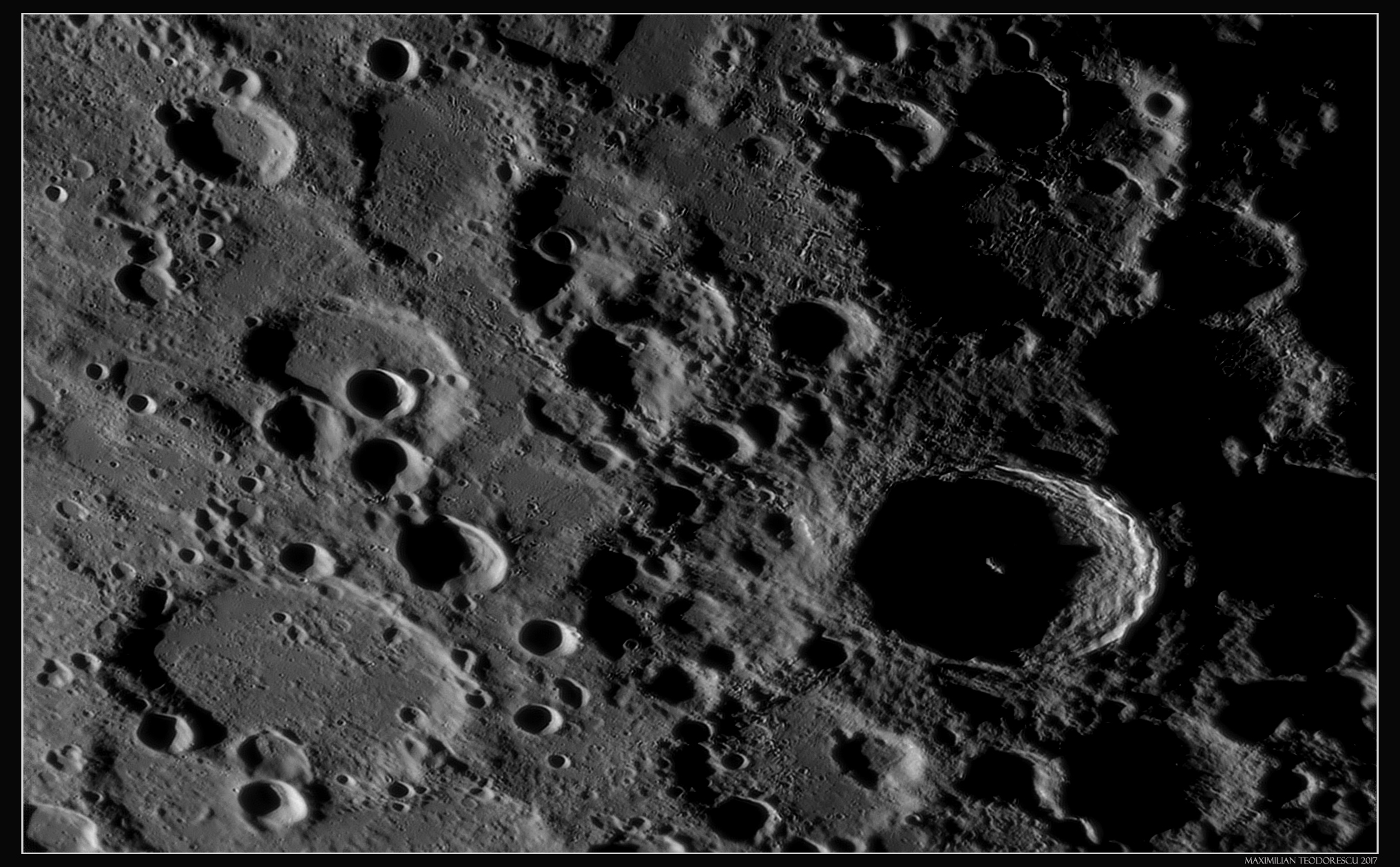 Also, a highly enhanced view of the same image, showing the inner terraces of Tycho, visible by the reflecting sunlight coming from the opposite walls of the crater. I had had to sacrifice the normally exposed lunar surface in order to see “inside Tycho”.