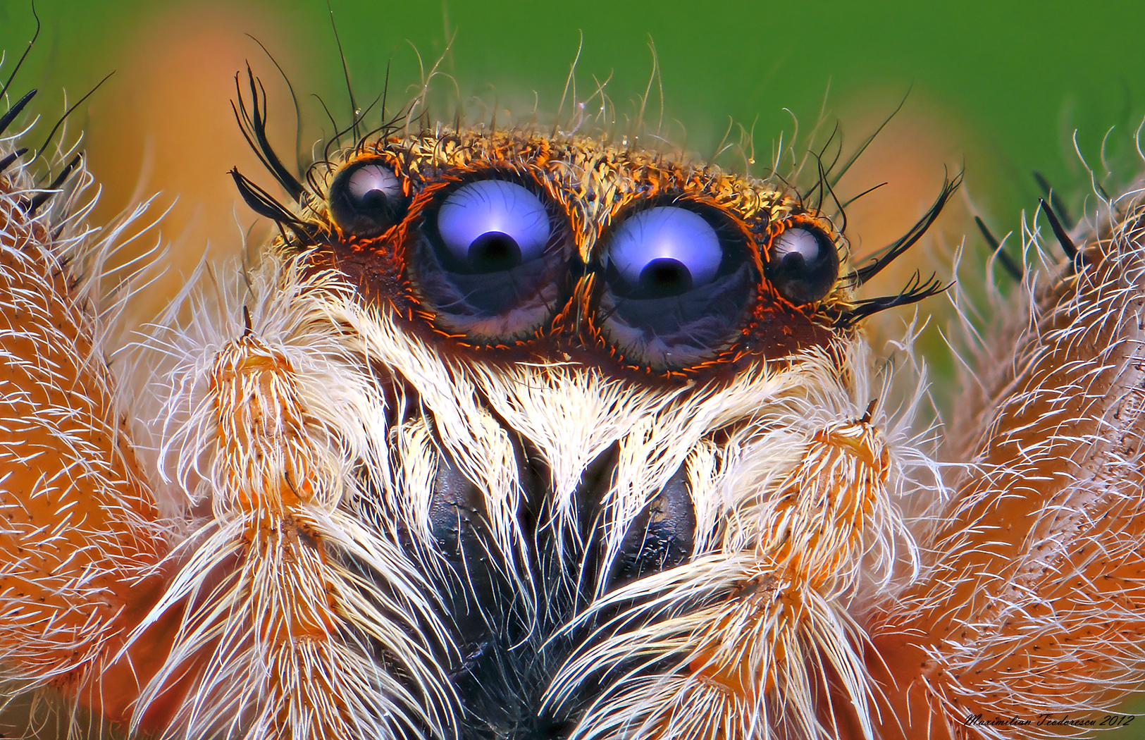 A collection of spider faces acquired during the last seven years. All these nice eyes belong to spiders in the Salticidae family, or better known as “jumping spiders”. Somehow the reason for such large eyes is obvious from their popular name: in order to get a good measurement of the distance to subject, they need some rather good resolution and thus large lenses π
