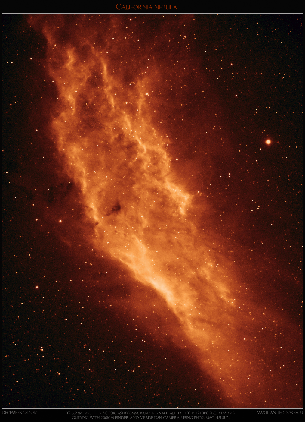 The following shot is a “double-first” for me: it is my first H-alpha deep sky image of a nebula, and also the first time I image this object.