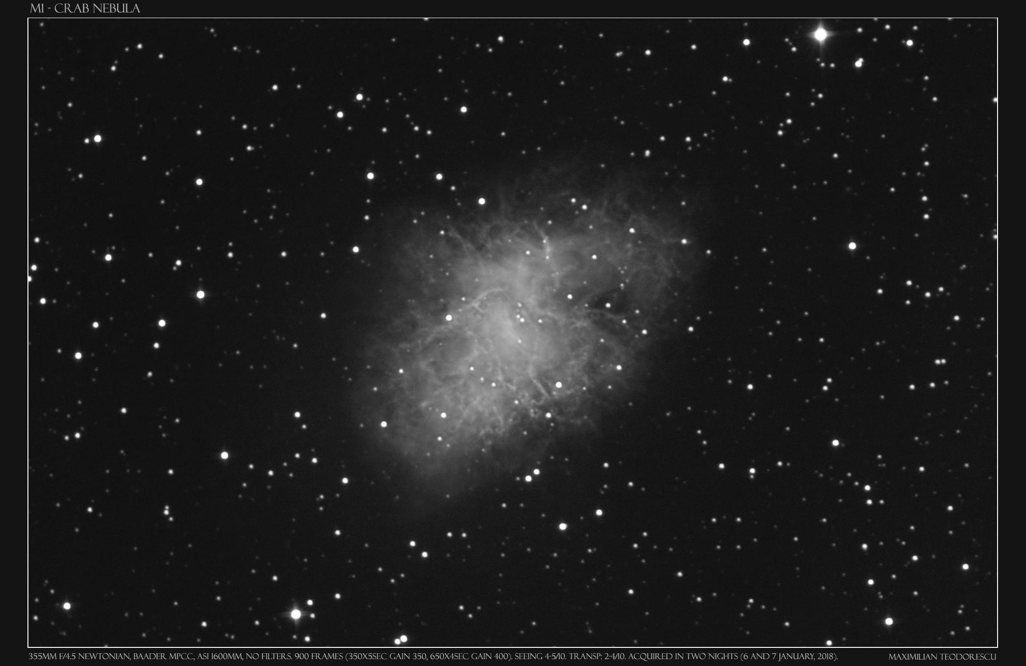 Using the “add hundreds of short frames” technique with the 14inch scope, I’ve managed to add some 900 frames of the very interesting object called “the Crab Nebula” in Taurus. The local conditions were very poor, with mostly mediocre seeing and cirrus clouds with some light fog, far from what “deep sky photography” requires. Nevertheless, the sole goal of this project was to get as many frames as possible of this object, and try to extract some fine details of the intricate structure inside it. After processing the following image, I’ve concluded that I need at least 2000-4000 more frames in order to get a nice final image of the object…So, the next couple of nights with clear skies will be dedicated to this crab…