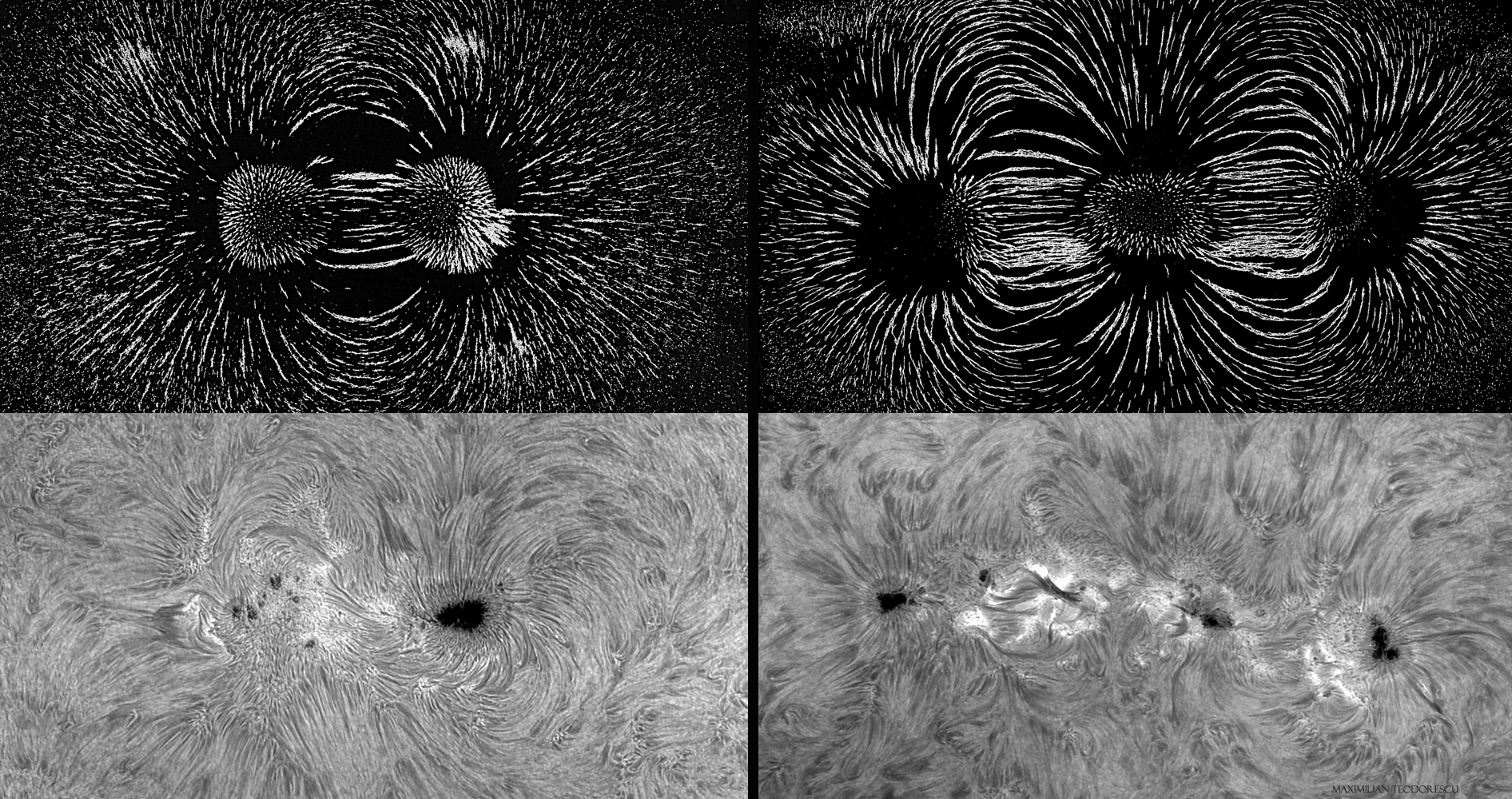 And a comparison of some homemade magnetic field lines and the aspect of some sunspot groups in H-alpha light. Note the similarities. They might not be the best examples, but they are my only ones showing similar structures on the Sun.