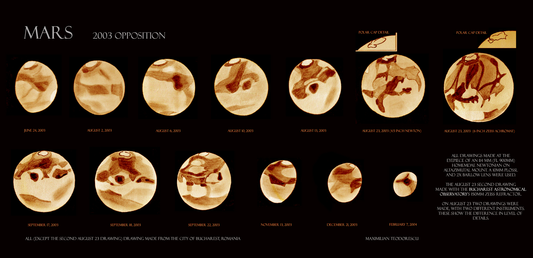 This is the case with the following collage showing the planet Mars at its closest opposition in 2003. Back then I was using my recently homemade 114/900 mm Newtonian on an altazimutal mount from the balcony of an apartment on the fifth floor of a building not too far from the center of Bucharest. Again, in 2003, Romania’s biggest city was way friendlier to Astronomy compared to these days: not too much light, fewer cars, more trees… The seeing was rather good and occasionally I could see the Milky Way…