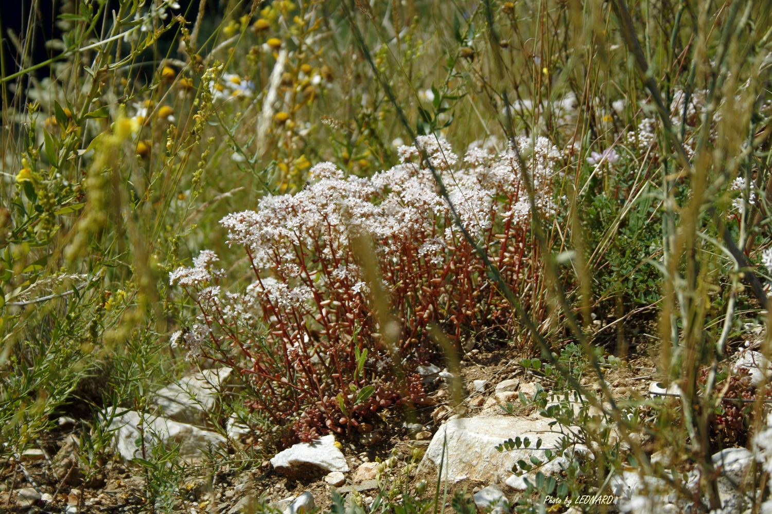 Further along the road, on the calcareous walls, tens of Sedum album plants were giving us the sign that Parnassius apollo should be…close.