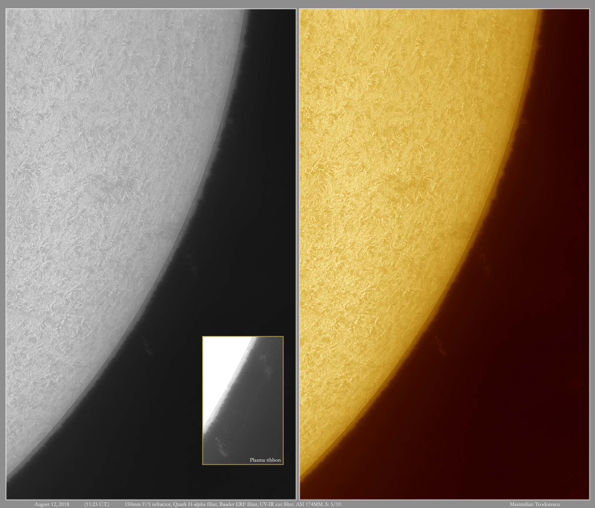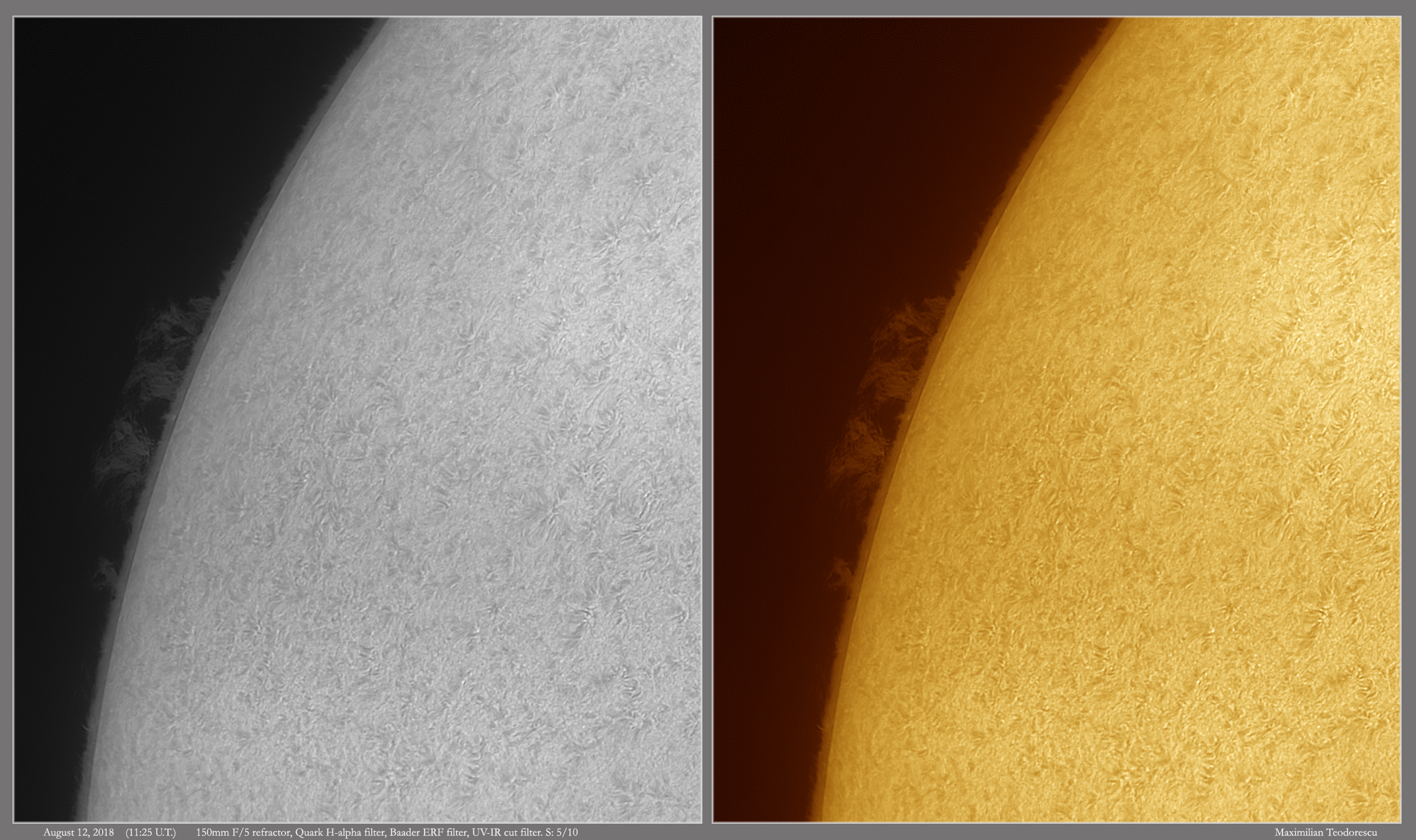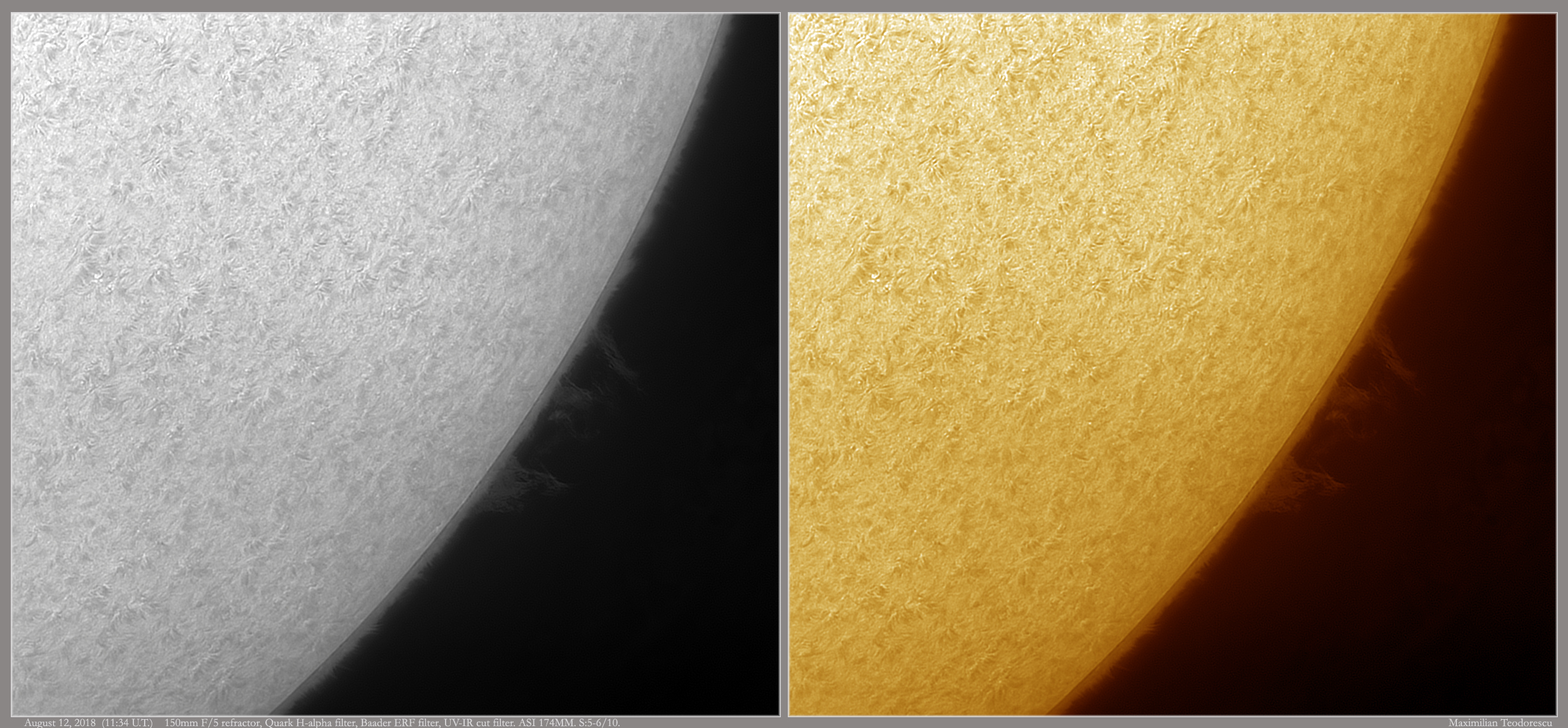 August 21, 2018H-alpha Sun – August 12, 2018 Scroll down to content Some almost forgotten solar images, from August 12. Nice proms at the limb, but poor activity on the disc. The seeing was not so great either. Share this: Click to share on X (Opens in new window) X Click to share on Facebook (Opens in new window) Facebook Like Loading... Related Published by maxpho An amateur...photographer, astronomer, entomologist...just an amateur ;) View all posts by maxpho