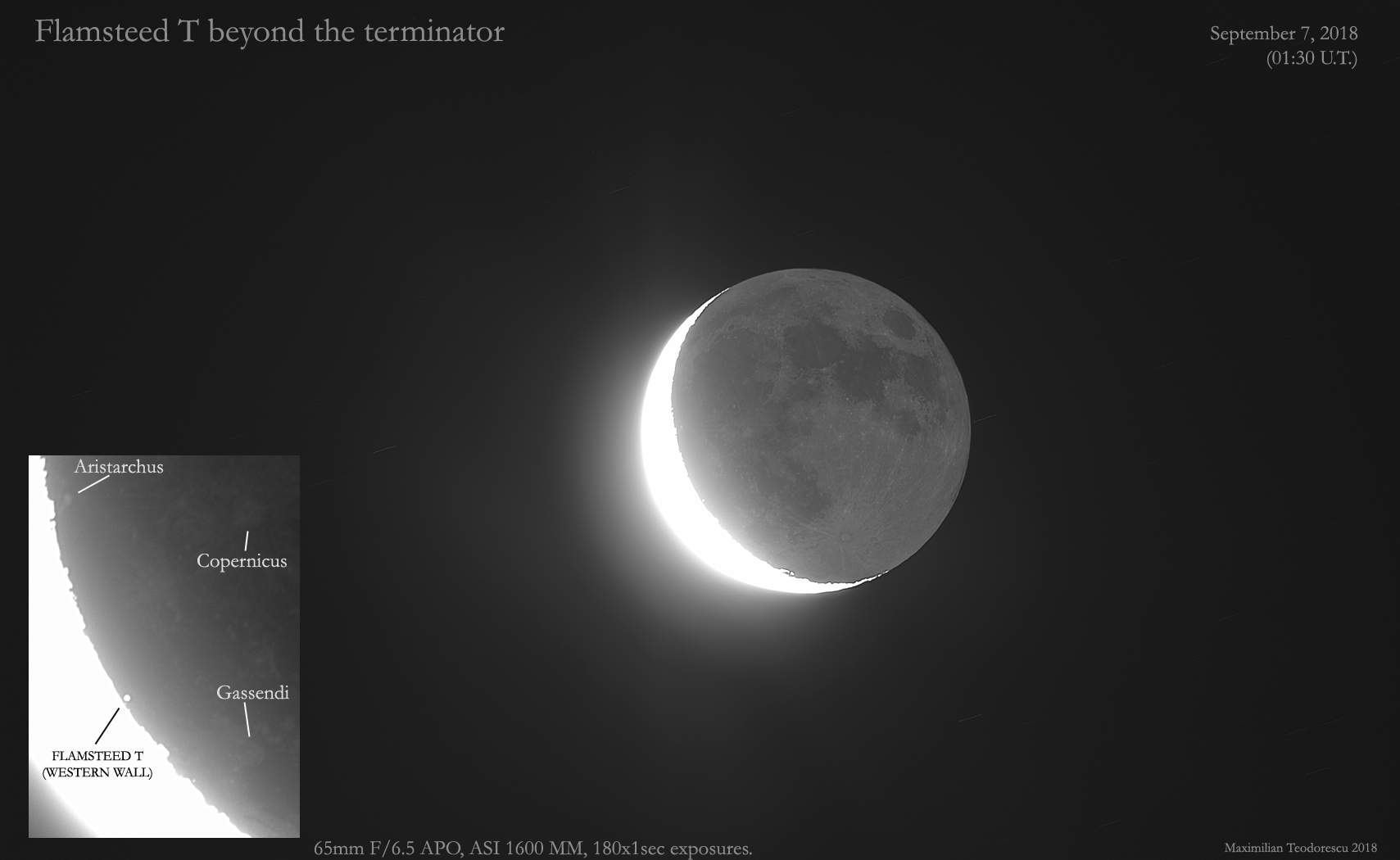 And now an interesting observation of a feature illuminated beyond the lunar terminator. In this case it is the western wall of Flamsteed T. Nice bright spot (at longer exposures) looking a bit off-place.