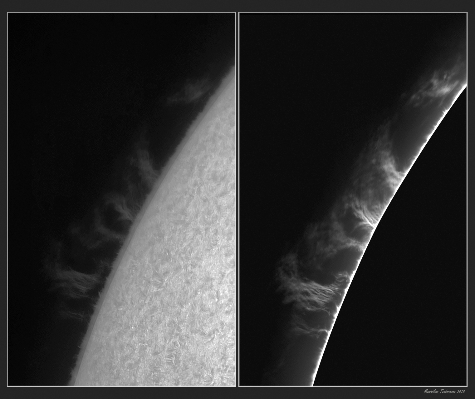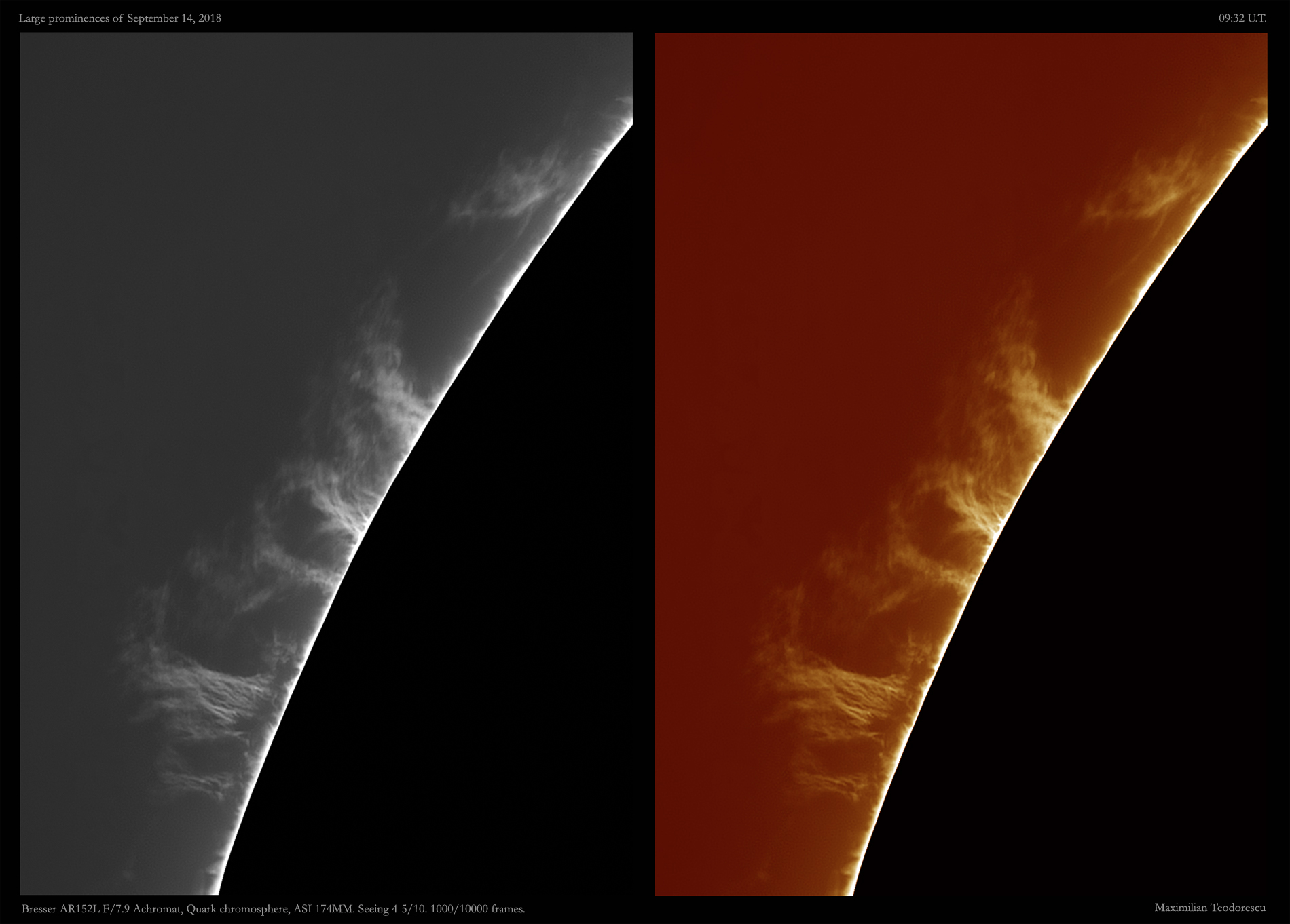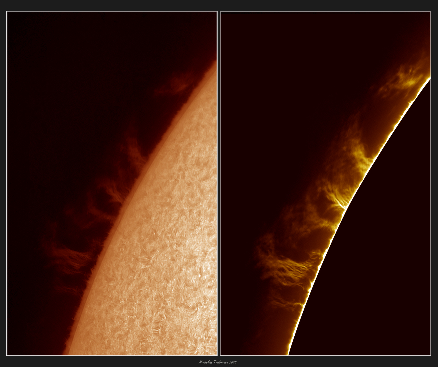 September 14, 2018September 14, 2018H-alpha Sun – September 14, 2018 Scroll down to content Testing a new scope today, another achromat refractor with a 6inch diameter. It seems that it is a good instrument for H-alpha solar images. Luckily some large proms were present of the Sun’s limb, but the seeing was not so great… Share this: Share on X (Opens in new window) X Share on Facebook (Opens in new window) Facebook Like Loading... Related Published by maxpho An amateur...photographer, astronomer, entomologist...just an amateur ;) View all posts by maxpho
