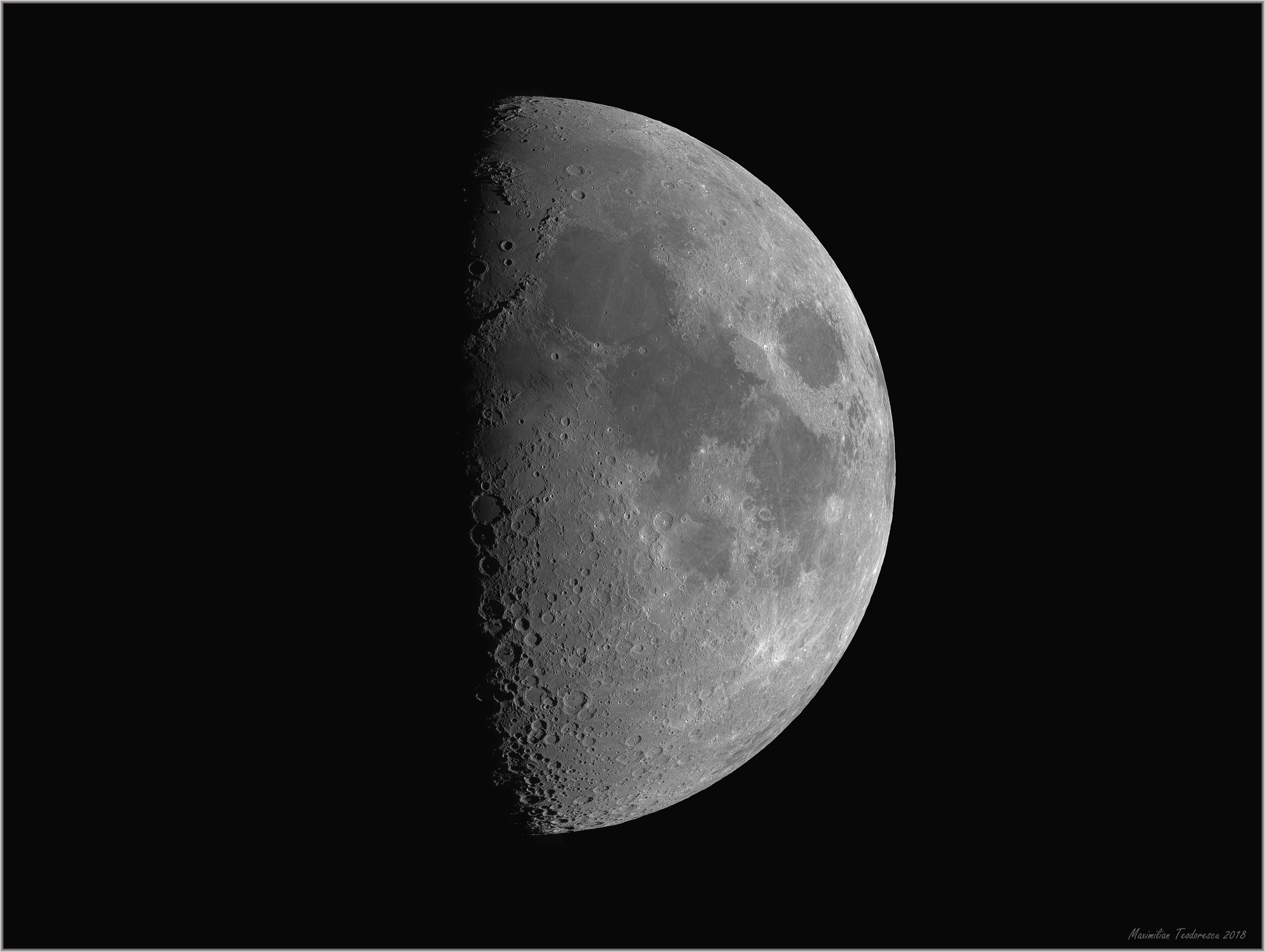 Following is a shot of the Moon, using the ASI1600MM with a green filter, placed directly in the focal plane of the scope. The Moon was rather low, at 20 degrees above the horizon, and the seeing was around 4-5/10.
