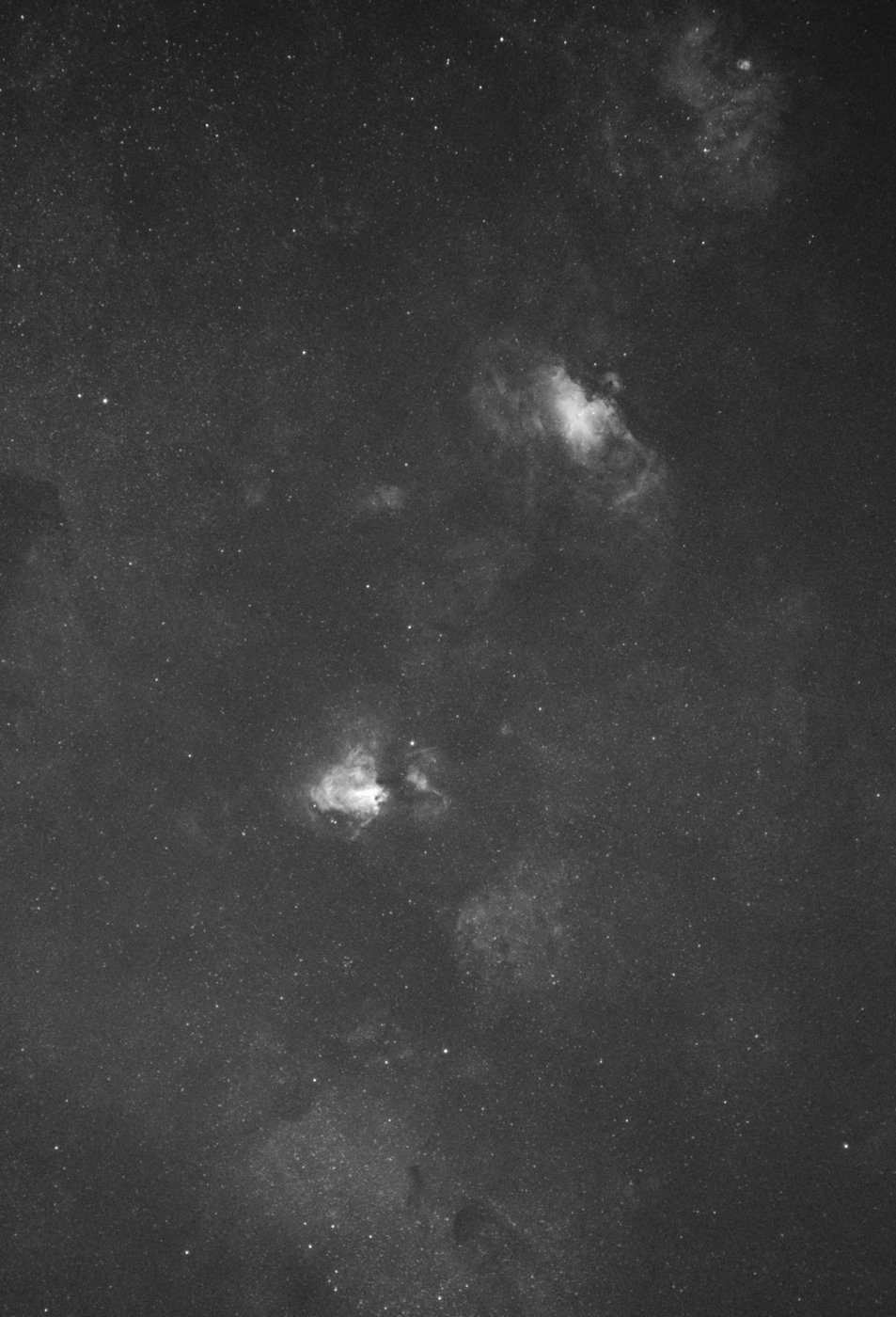 And another short test, just to see “what’s out there”, in an area that includes the Omega and Eagle nebulae. Only 4x120sec shots and 1 dark were acquired. The Moon was also pretty close by, and the area was already rather close to the horizon; still a lot of fainter hydrogen signatures can be seen in the background: