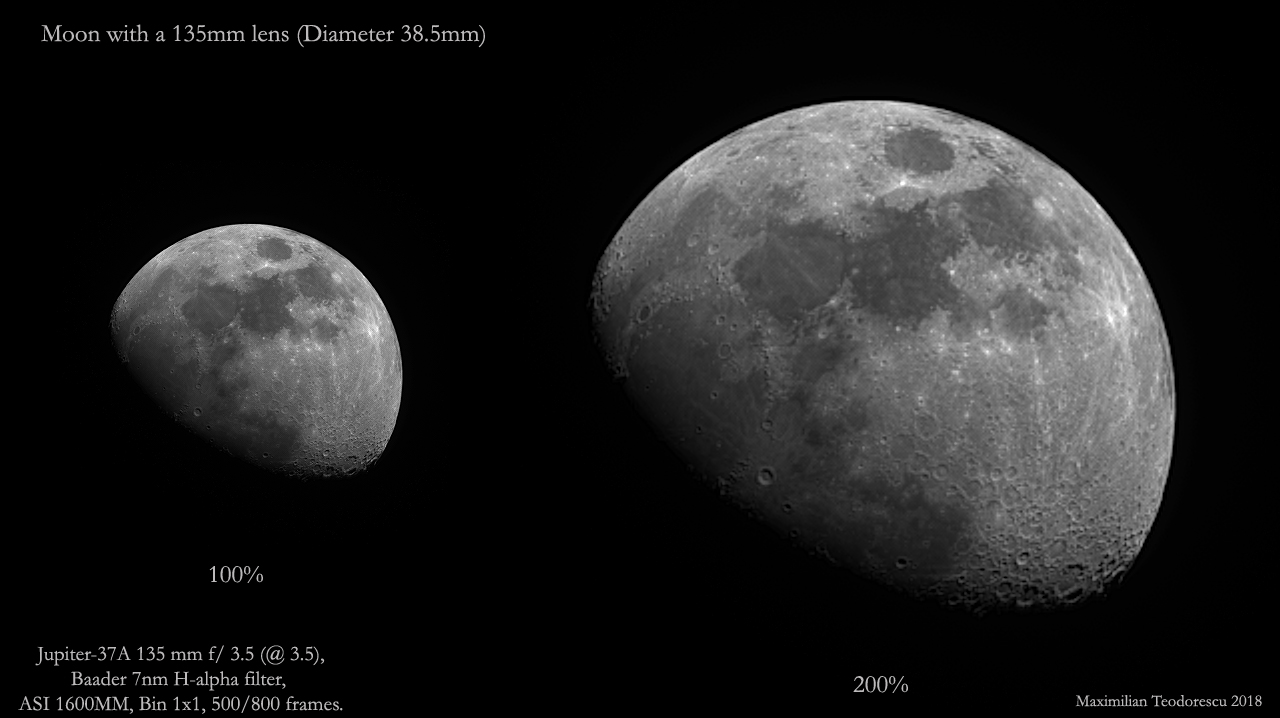 Now, for the test: the main reason for choosing this lens for this session was to have aΒ wider field of view on some deep-sky objects in H-alpha light. The nominal 135mm focal length is perfect for the job, when combined with the small pixels of the ASI 1600MM camera. But to focus the system, I’ve first pointed at the Moon. The result is spectacular I might say, with lots of identifiable craters detectable in the image. Very sharp image, and this with the lens wide-open at F/3.5! Indeed, it was done through the H-alpha filter, so not much optical aberrations would have been detected, but this also means that the lens is very well corrected in the red part of the spectrum. And this is from a lens of just 38.5 mm in diameter!