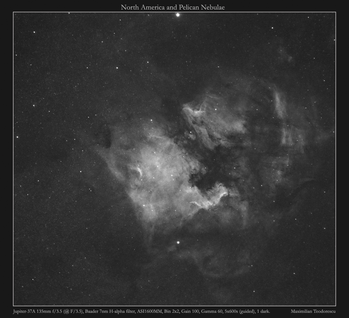 With such good resolution, the next target was chosen: the North America-Pelican nebulae. Only five frames (each a 10 minutes exposure) for this one for now, but it will definitely be my subject for the next clear nights: