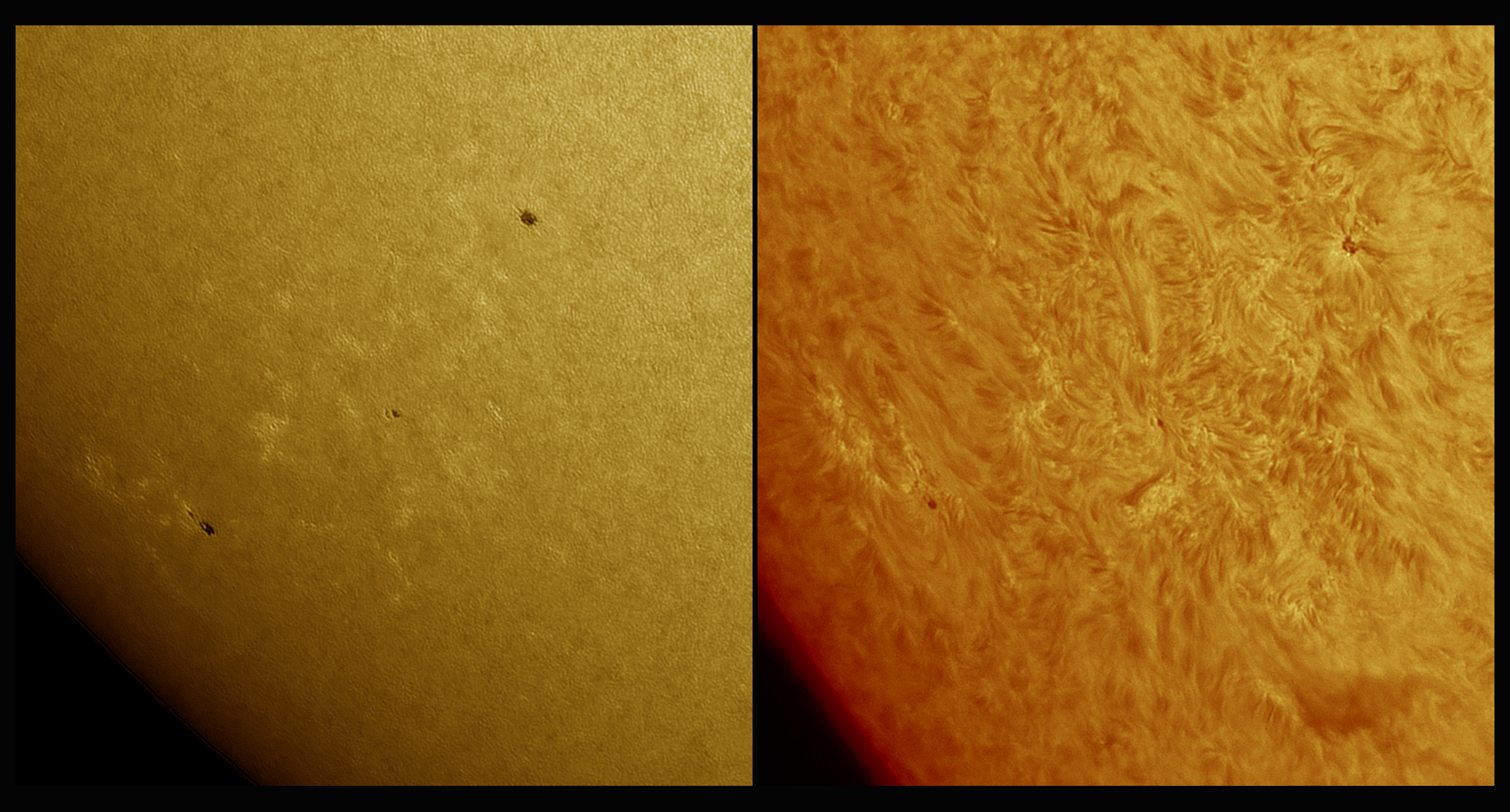 A short session with the Sun and the new active region. Strong wind, poor seeing, but a nice warm day. Just a comparison between the white light photosphere view with the H-alpha view of the chromosphere.