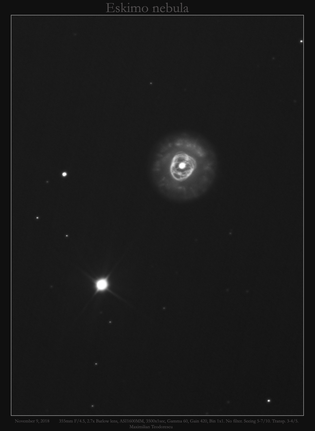 This is an image of the well known planetary nebula “Eskimo” in the constellation Gemini. A well placed object in the winter sky, and a nice view in instruments above 100mm in diameter.