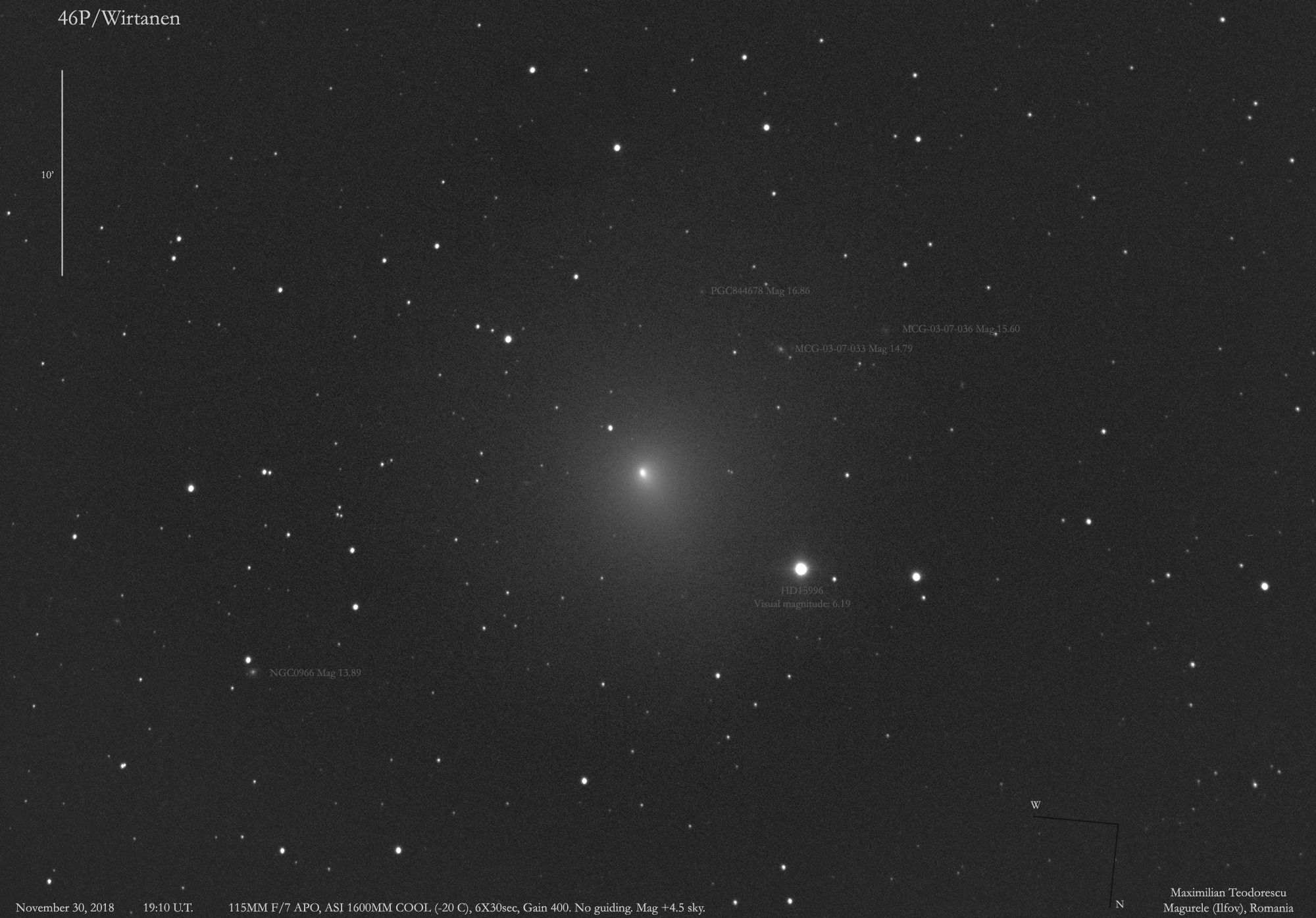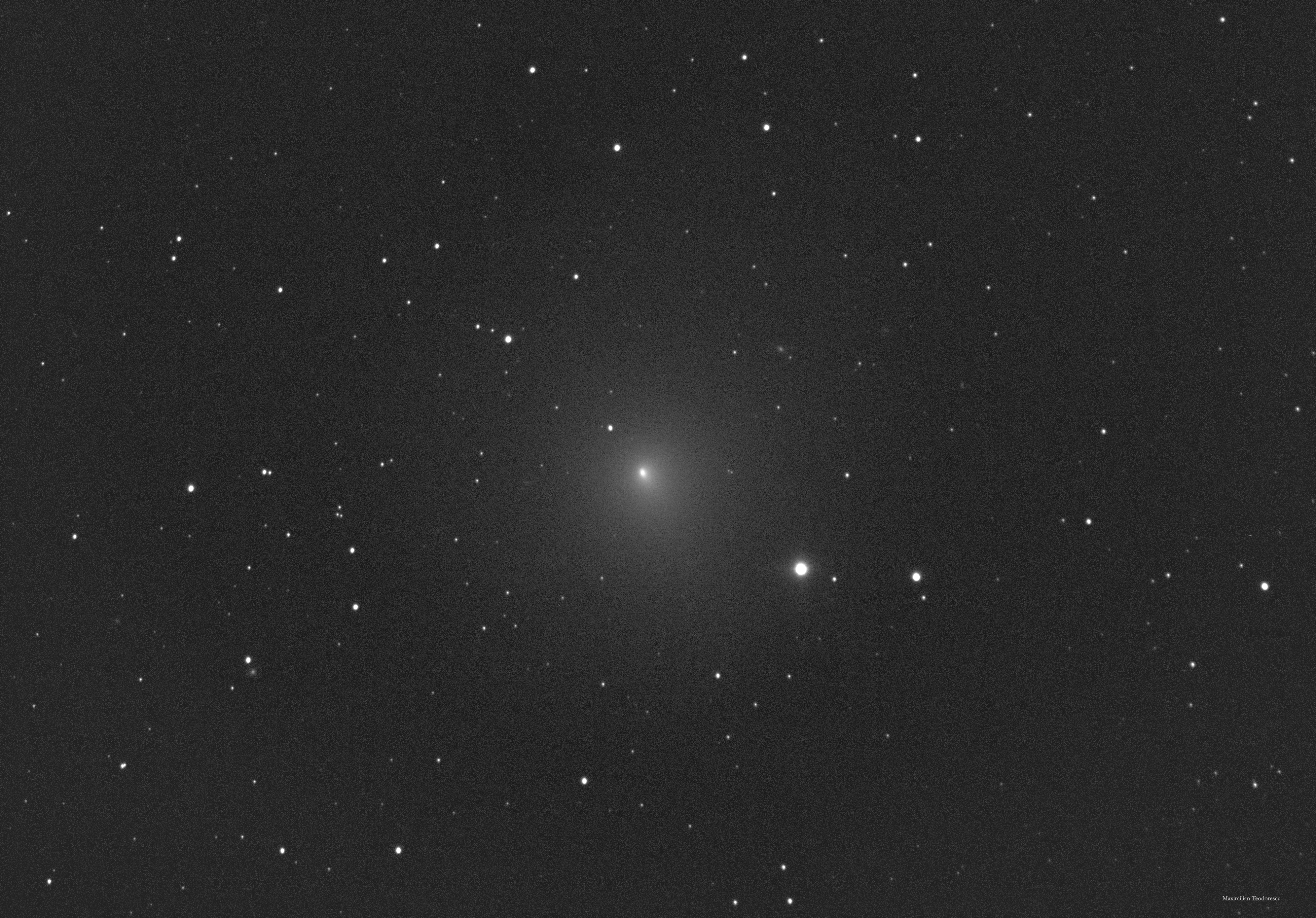 A fresh image of comet 46P/Wirtanen, under poor skies and only a handful of frames. Very cold, -12 Celsius, with ice forming on the entire setup. Very poor seeing. The comet’s coma is elongated, but no tail is discernible. Some rather small galaxies are visible in the background. The coma is 20 to 30 arcminutes in diameter in this image.