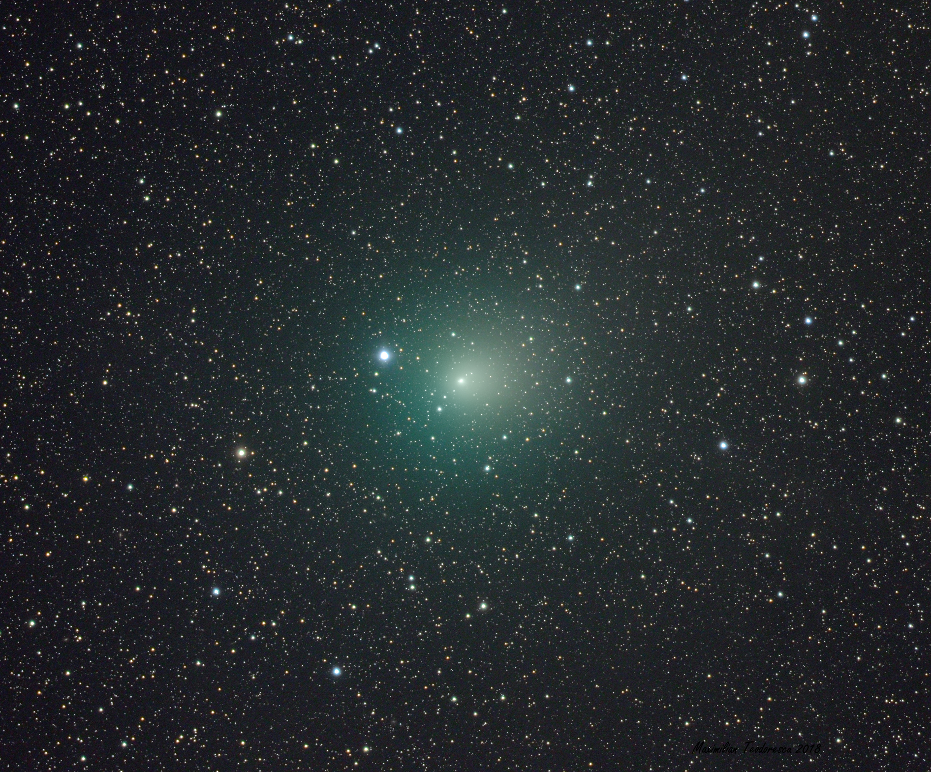 Equipment: TS 65Q APO F/6.5 Refractor, ASI 1600MMC Pro (bin 1×1, gain 100), Baader RGB filters, EQ6, unguided. Luminance: 34x30secs exposures tracked either on the comet or the background. RGB: 4x30sec each. Processing in DepSkyStacker, Registax, AstraImage, Photoshop.