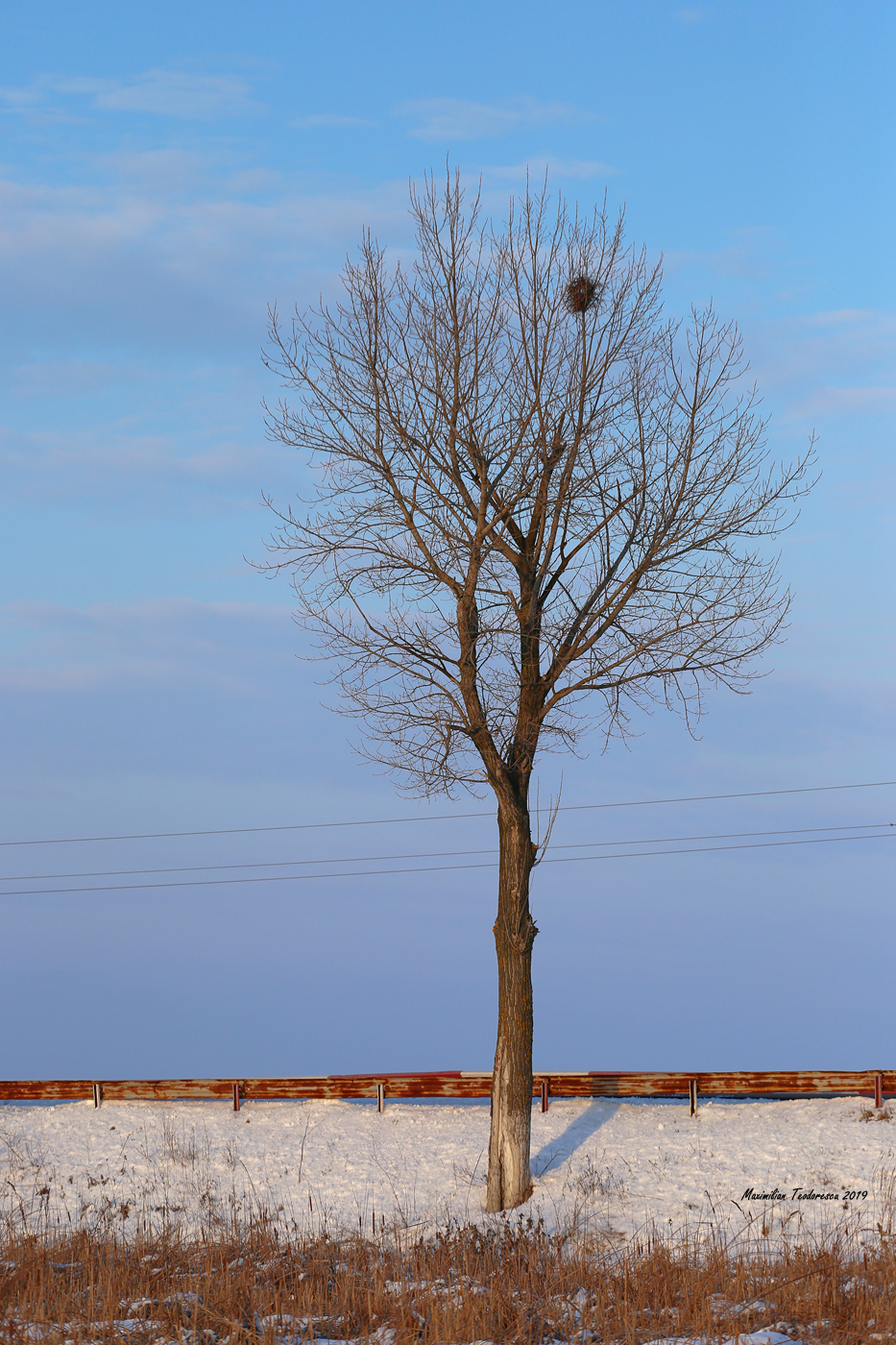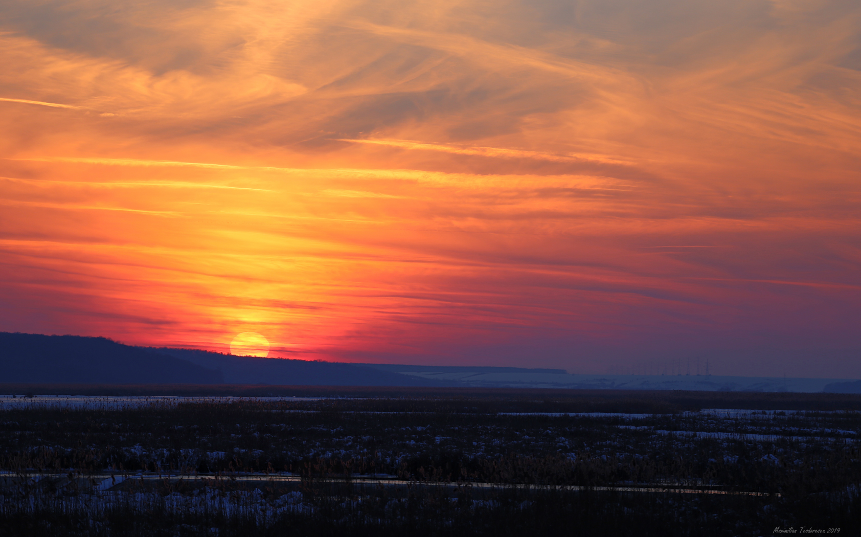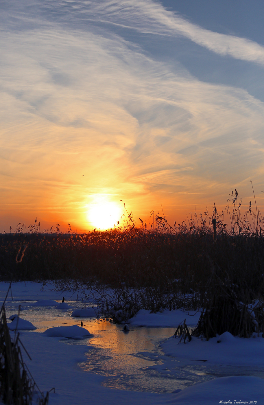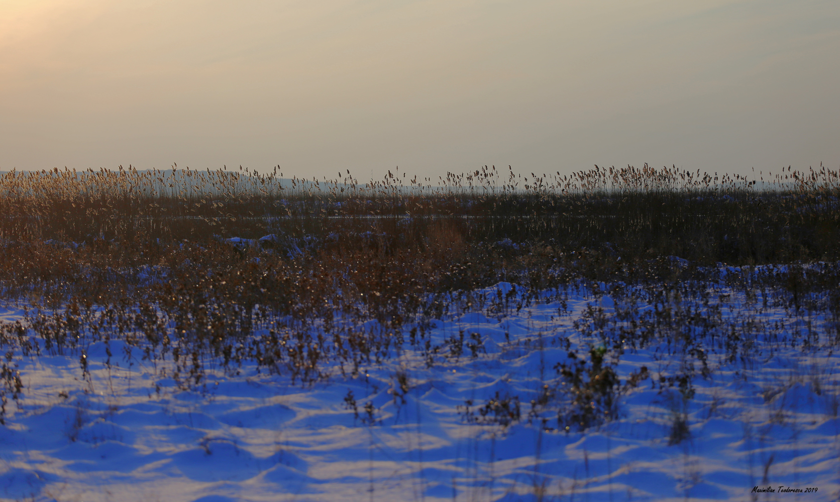 Not many subjects to test the equipment, but some spectacular light and colors: the blue of the sky reflected by the snow, and the reddish cirrus clouds and tall grasses.