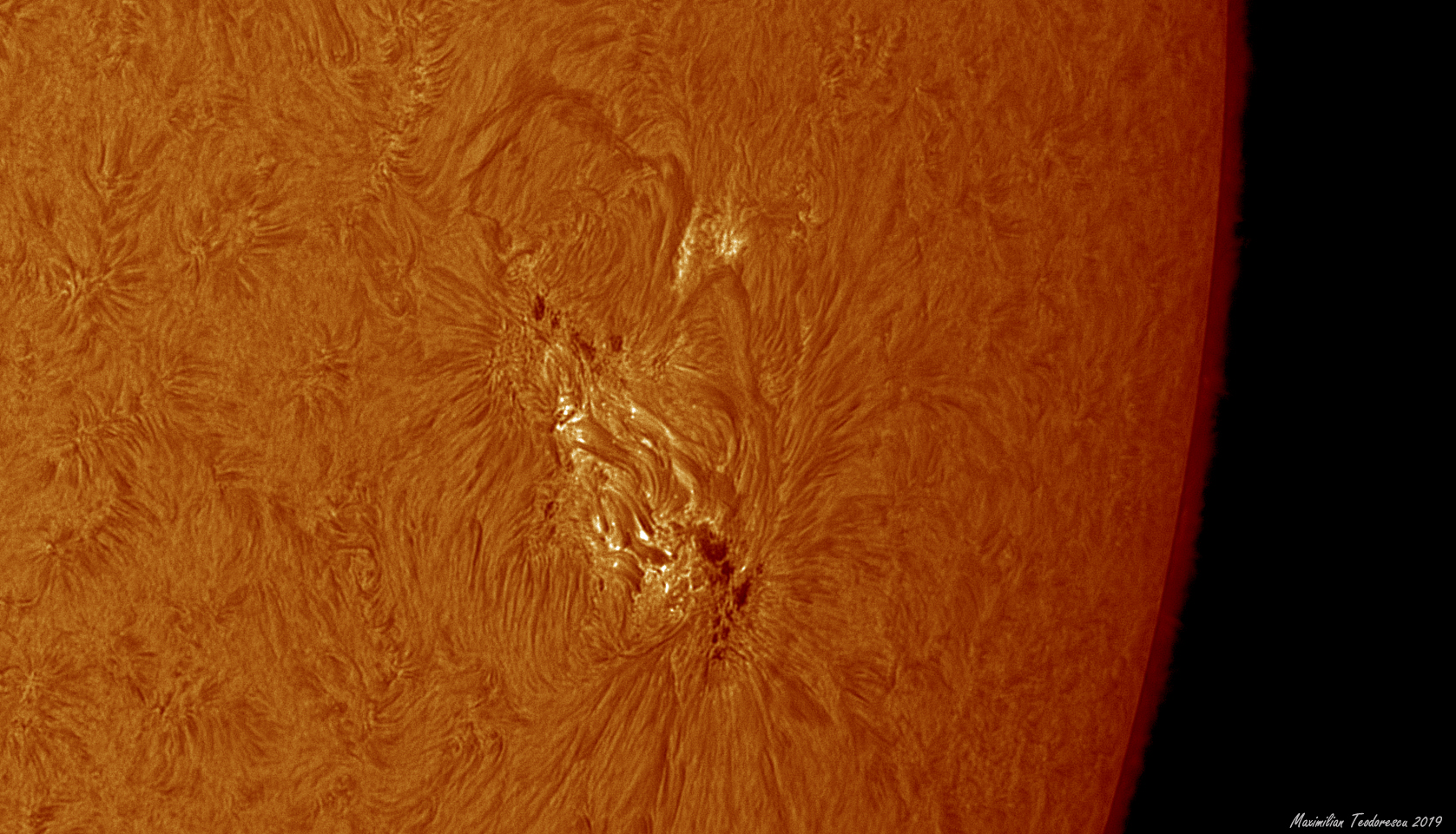 My first H-alpha solar image of 2019, and a superb subject: a very fast growing sunspot group, designated AR2736. A source of C-class flares. And a joy to observe the fast changing chromosphere inside this group. a lot of Ellerman bombs are also detectable in the image.