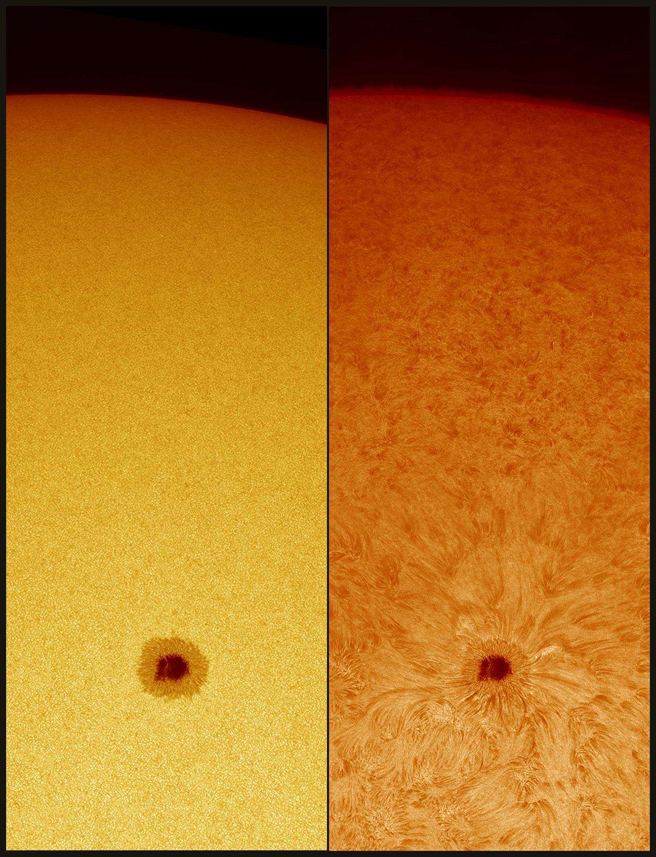 A lovely large sunspot is evolving on the Sun these days, with currently B-class flares and a possible breakup. The views below show the spot in white light and H-alpha. Note the chromosphere in the animation as it stands above the photosphere.