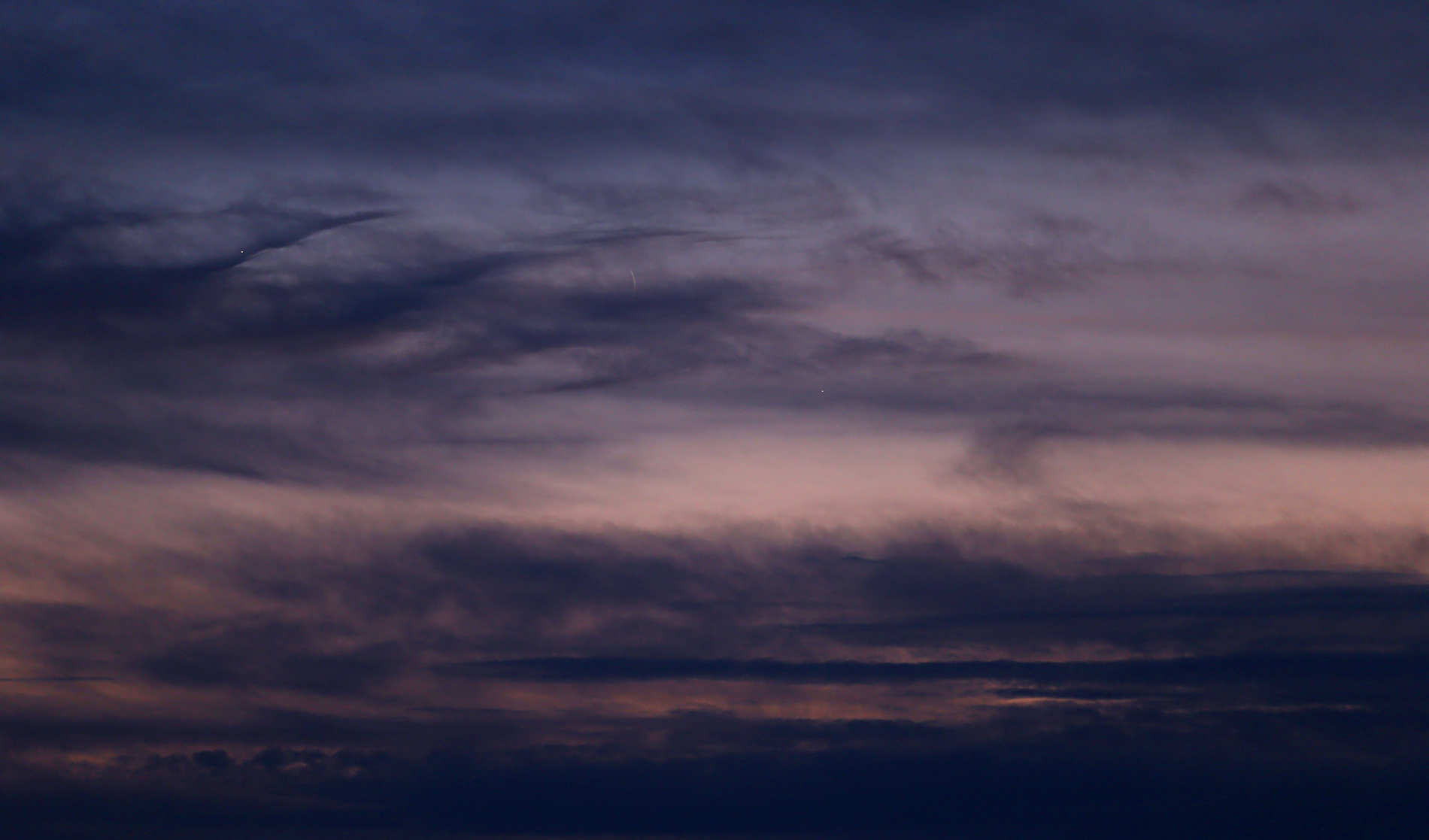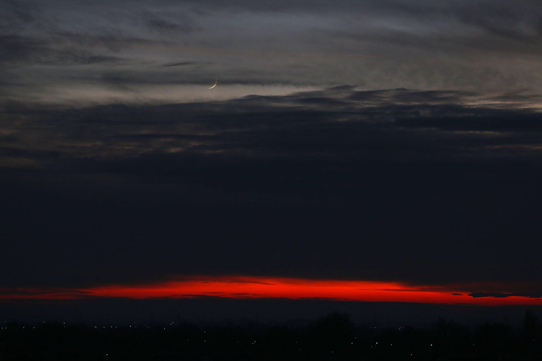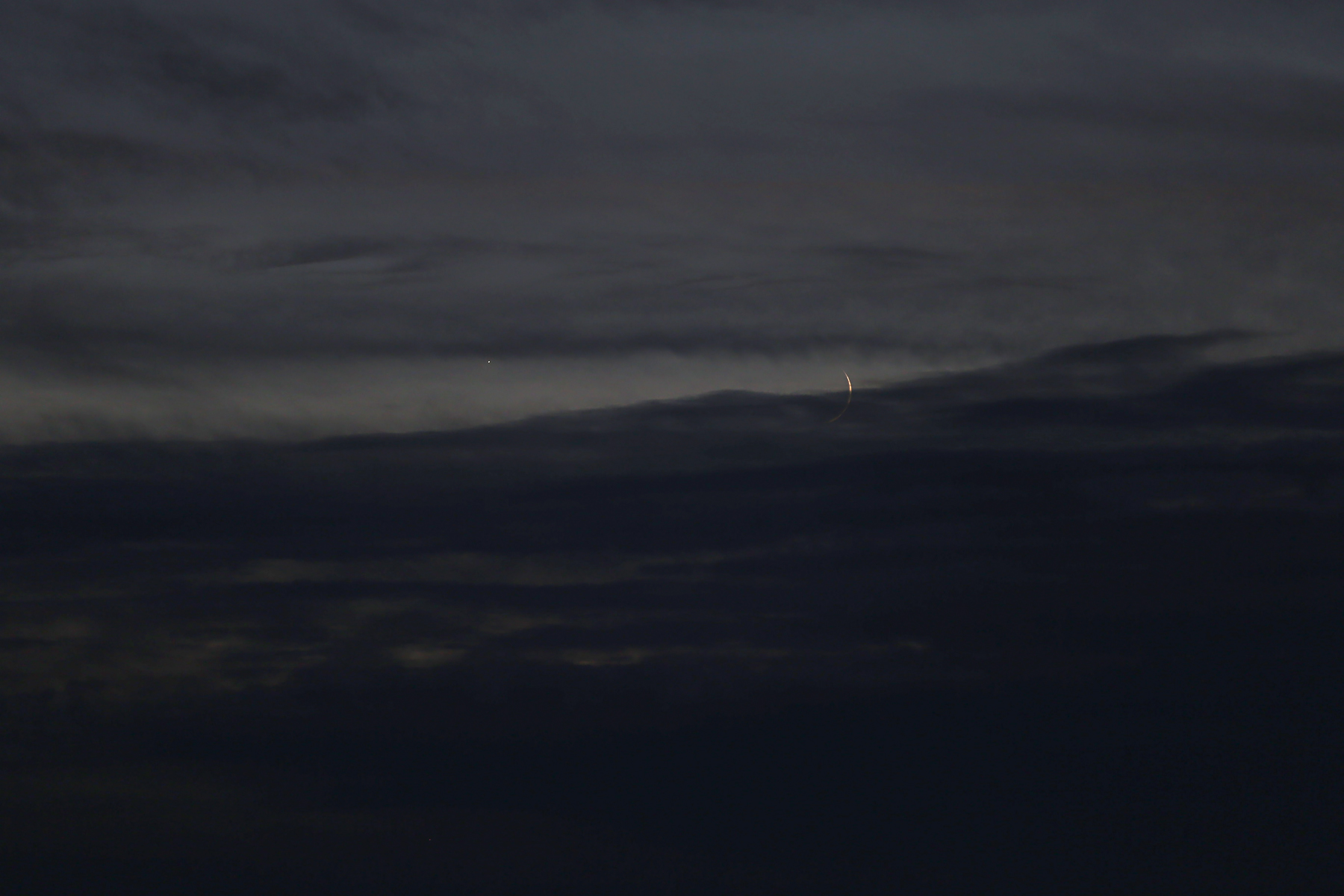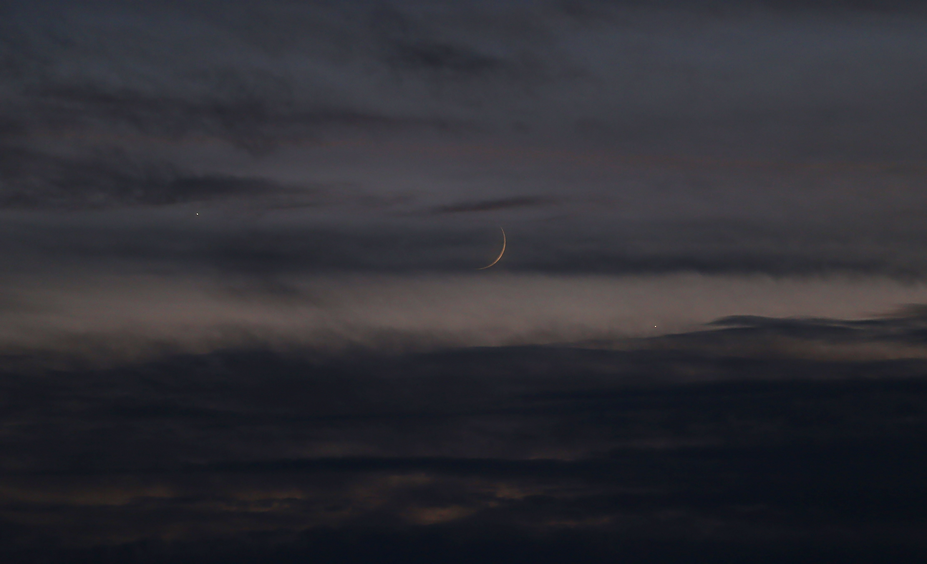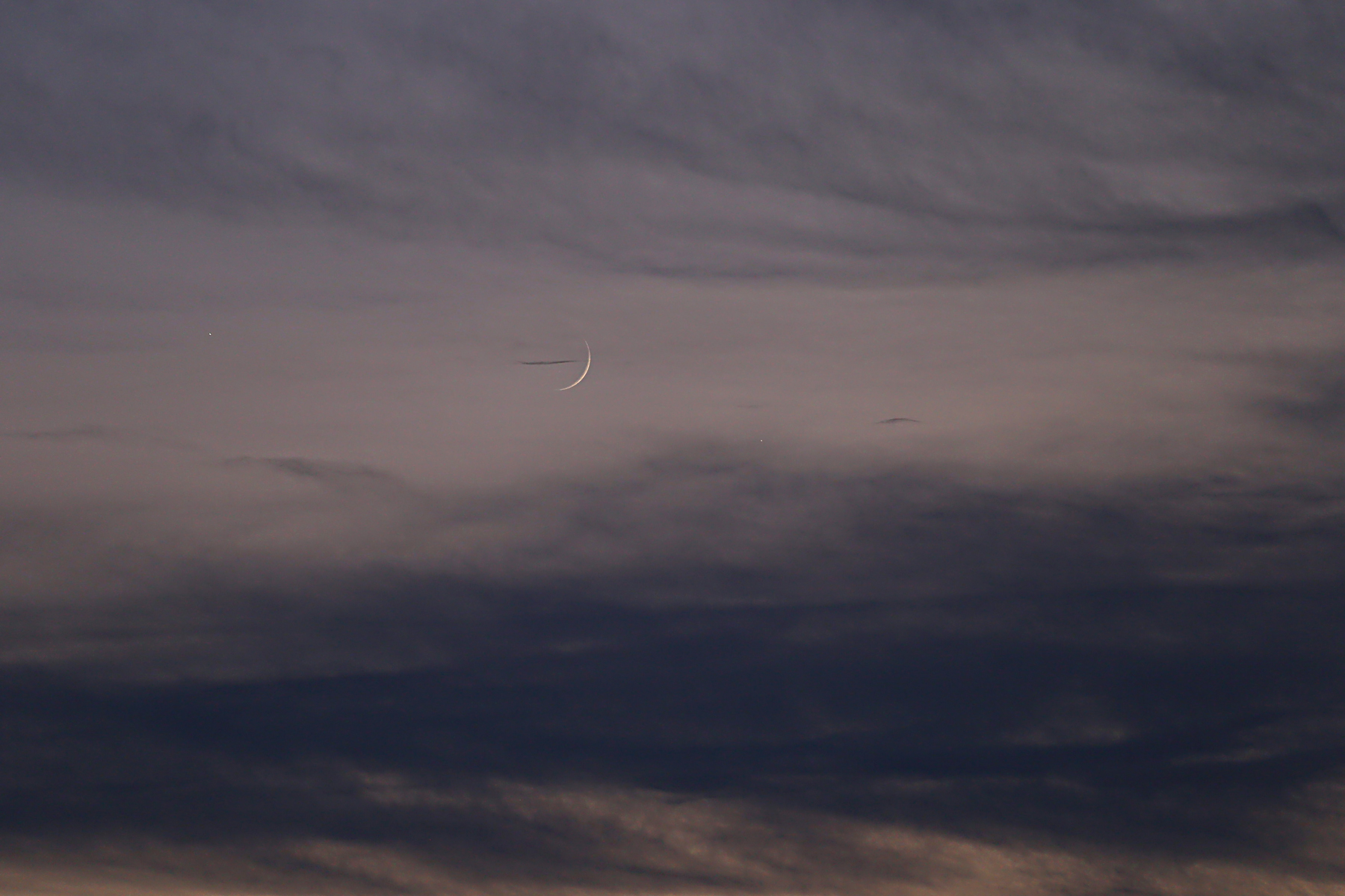 Lovely configuration after the sunset these days. Not easy to see from my location due to uncooperative clouds, but still, I was able to catch a glimpse of Jupiter (lower right), the Moon and Venus (upper left).