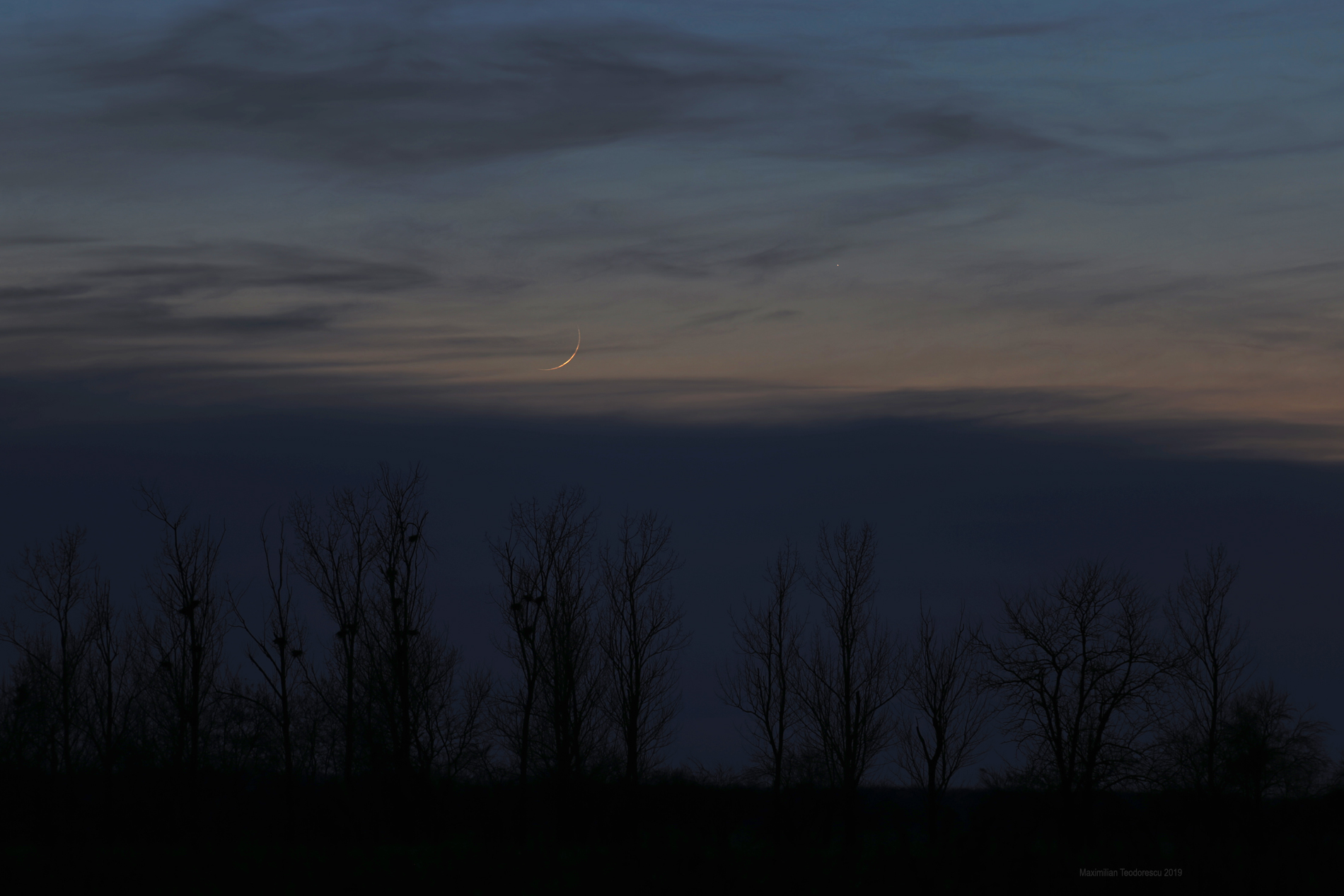 A short trip for some other interests (in the region of the Comana Woods) allowed myself and my brother-in-law to get some nice views of the not too-often viewed young Moon after sunset. Pretty hard to spot it, with cirrus clouds and not so good transparency. Only home did I noticed that Saturn was also spotted in some of the frames.