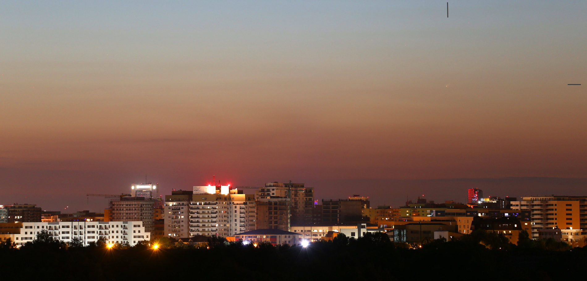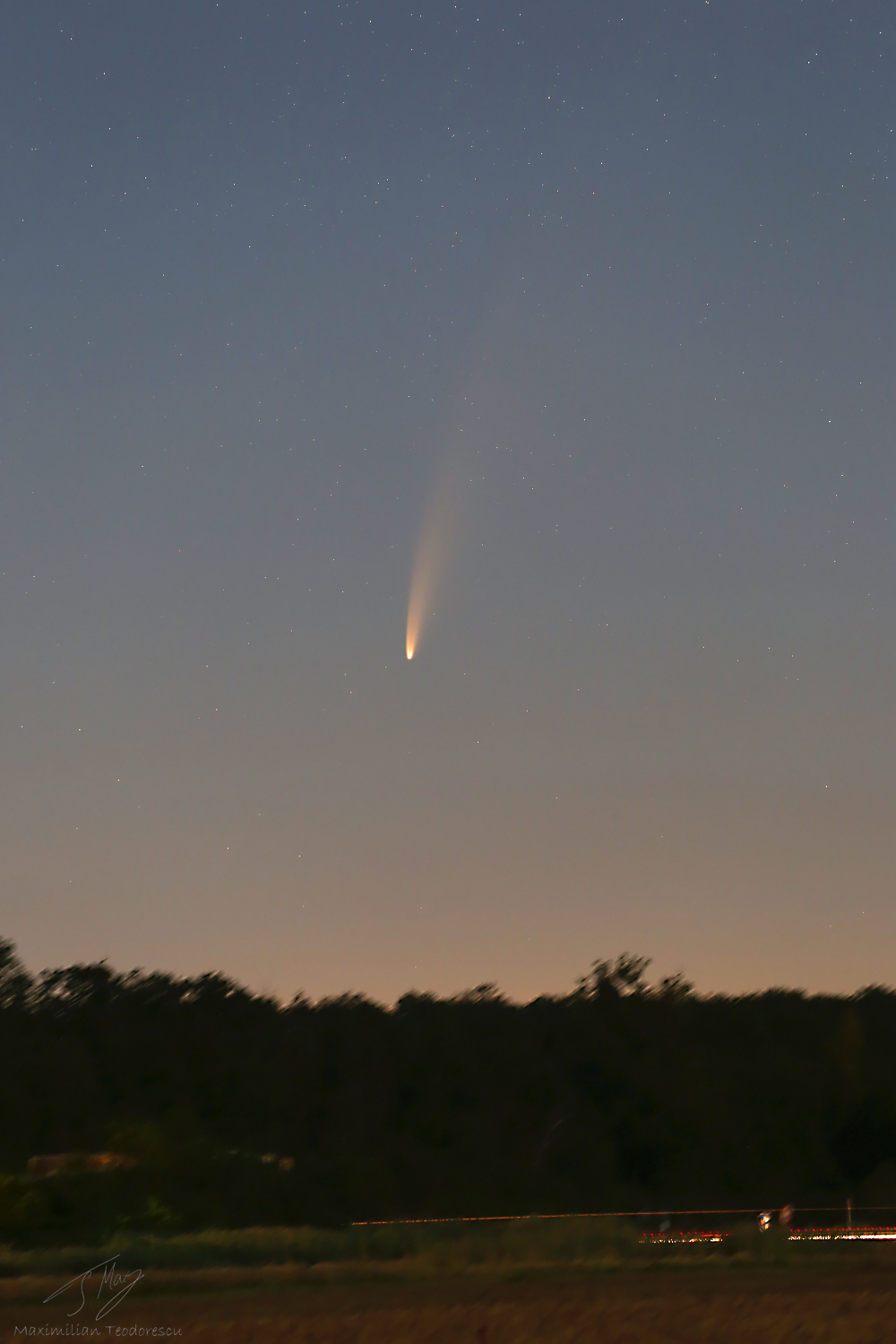 After loosing a few days of this comet due to other activities, I’ve finally manage to get my motivation up and drove 40 kilometers from home, near a highway. To be honest, I was not prepared for this show: a nice 1.5 degrees tail rising from behind some trees almost perpendicular to the horizon. I’ve estimated the comet at around Mag 0, with a +2 nucleus, but all this in the glare of the Moon and some haze. I did however shoot the comet with two different lenses, and found the tail to be around 4 degrees in length. Also the faint ion tail was detectable. This comet starts to look similar to the 1997′ Hale Bopp…which is good đ