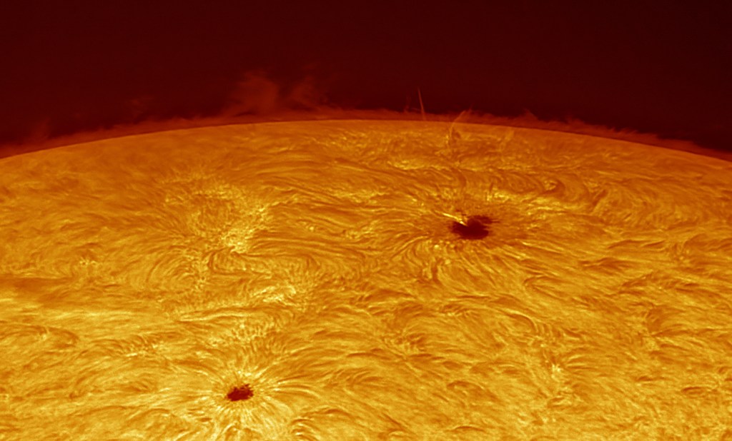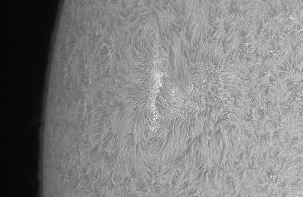 While testing some filters (both H alpha and others), I’ve also acquired a few views of today’s solar features. A few spots, a few proms, and some other details observable in the chromosphere. All shot with the 150mm achromat and Quark filter.