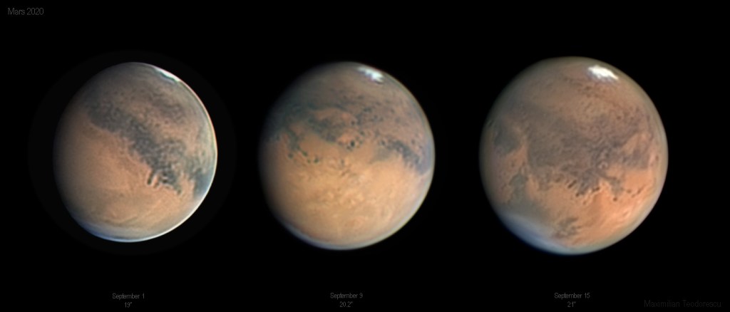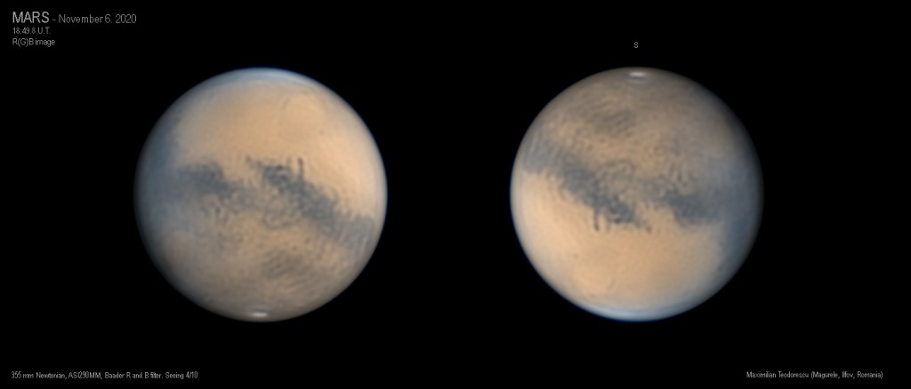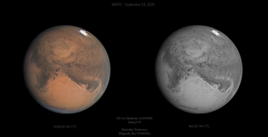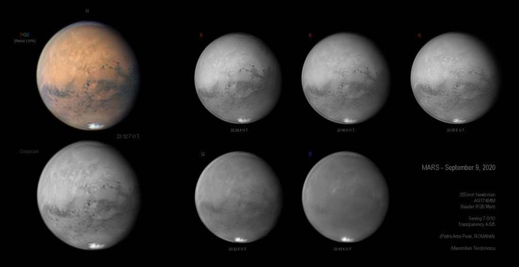 Mars on September 9, 2020, from high up in the mountains, near Piatra Arsa Peak. Some very good to excellent moments of seeing, but mostly fair to good.