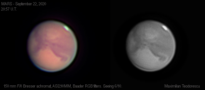 Mars under fair seeing conditions on September 22, 2020. Note the clouds at the terminator in the B image.