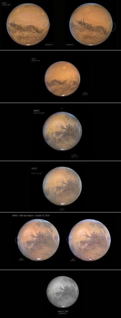Mars on October 23, 2020 showing the dark streak again, but somewhat fainter. The seeing conditions were also only fair, with some poor moments also. The animation spans the interval between 22:44 and 23:24 U.T.