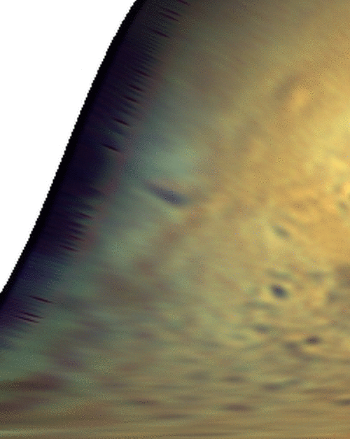 Secondly, the dark streak looks that it shifts its position and also fades as it gets further away from the terminator. It actually looks like it is moving with the surrounding clouds (which are visible in the animation).