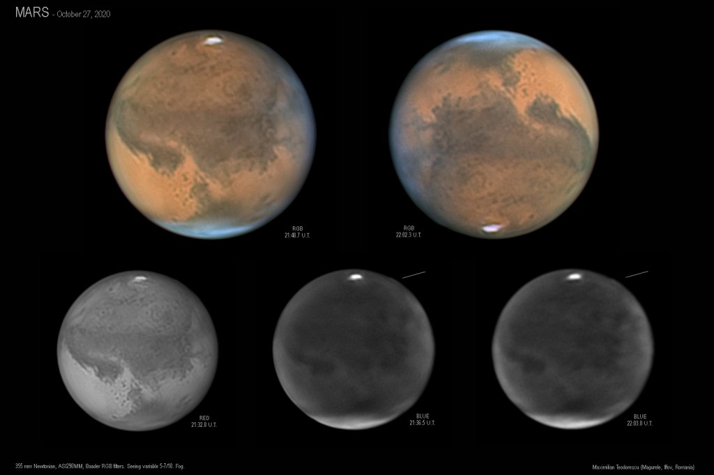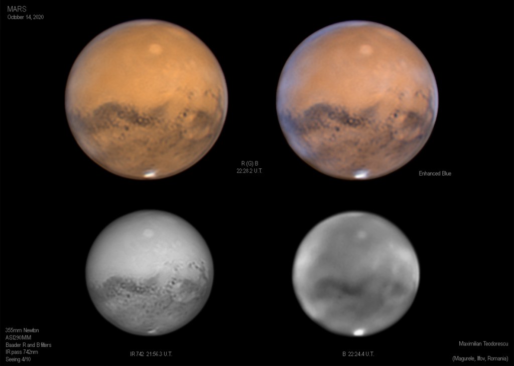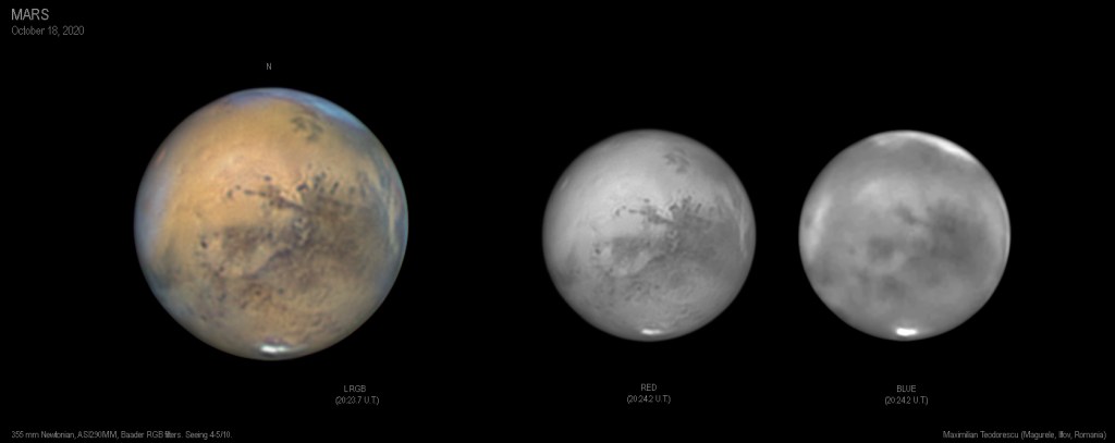 Mars on October 10, 2020: LRGB images and Blue filter images. Note the clouds in the Blue images: a lot of activity compared to just a month ago.