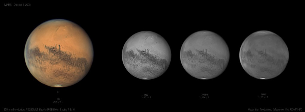 Mars on October 23, 2020. This was acquired some time before the dark streak was visible. Interesting to note the cloud activity in much of the South-West (lower left) quadrant of the planet, best visible in the B filter image.