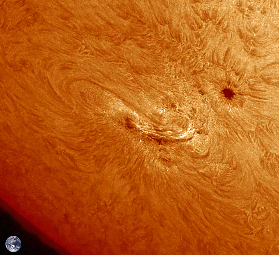 Giant sunspot AR2781 on November 5, 2020. Images acquired with a 150 mm achromat, Quark H alpha filter and ASI174MM. Fair seeing. The Earth was inset for size comparison. A second image shows also a H-alpha view, but with the filter set a bit off-band. Lots of Ellerman bombs are detectable.