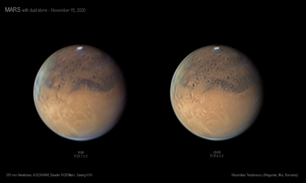 Mars on November 24, 2020. The extent of the dust storm is apparent now, as most of the area East (left) of Solis Lacus is covered with dust. I have also included a strongly enhanced color processing for better contrast of the dust; basically everything that has a greenish tint is dust.