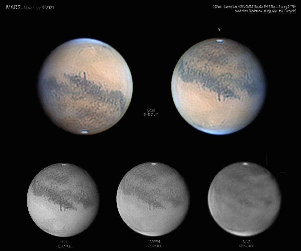 Planet Mars on November 8, 2020. Good seeing for this session. A high altitude cloud is visible on the terminator; it is marked in the Blue filter image, but it is visible in all three filters. Lots of have/clouds on the entire planet.