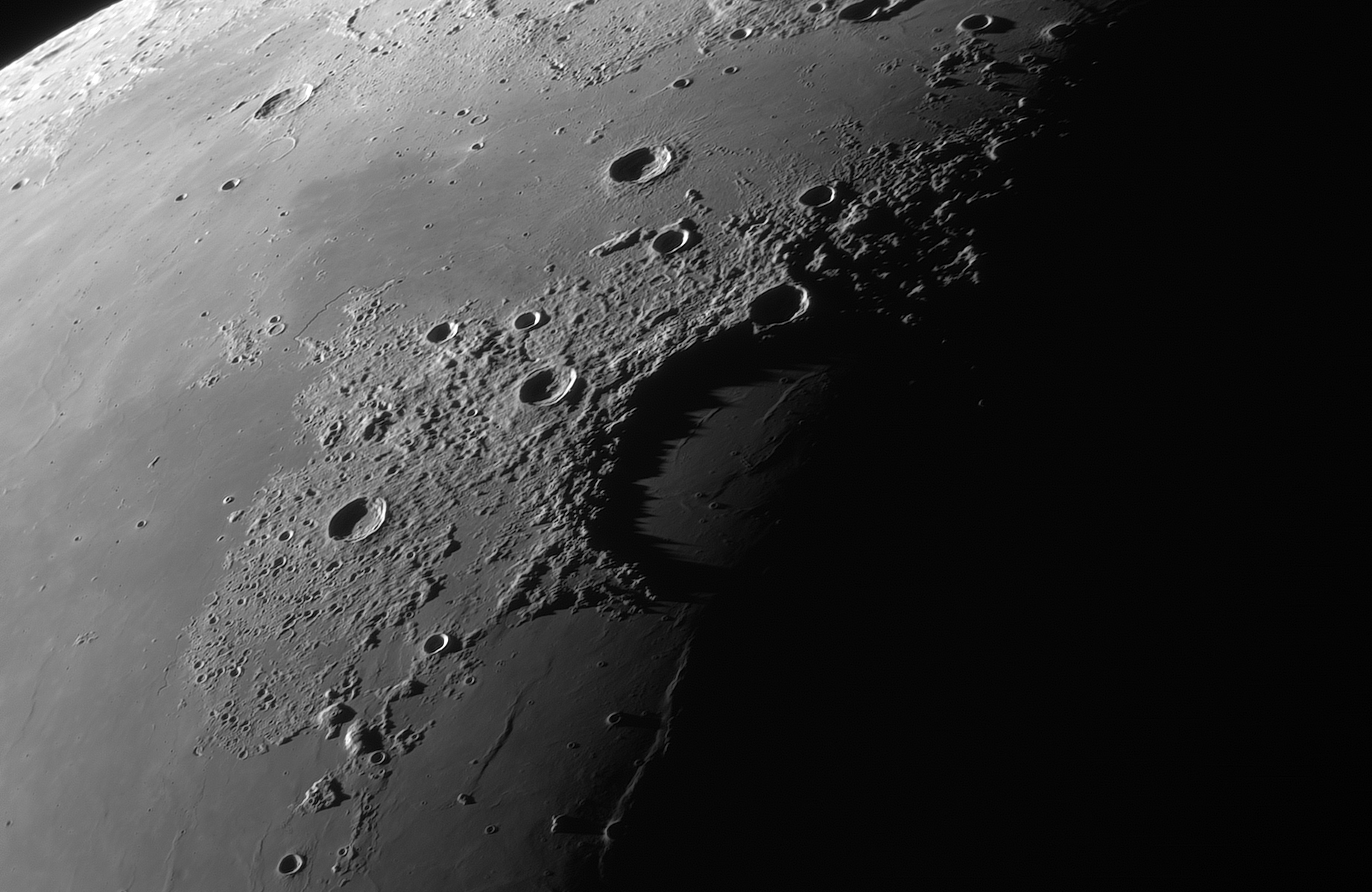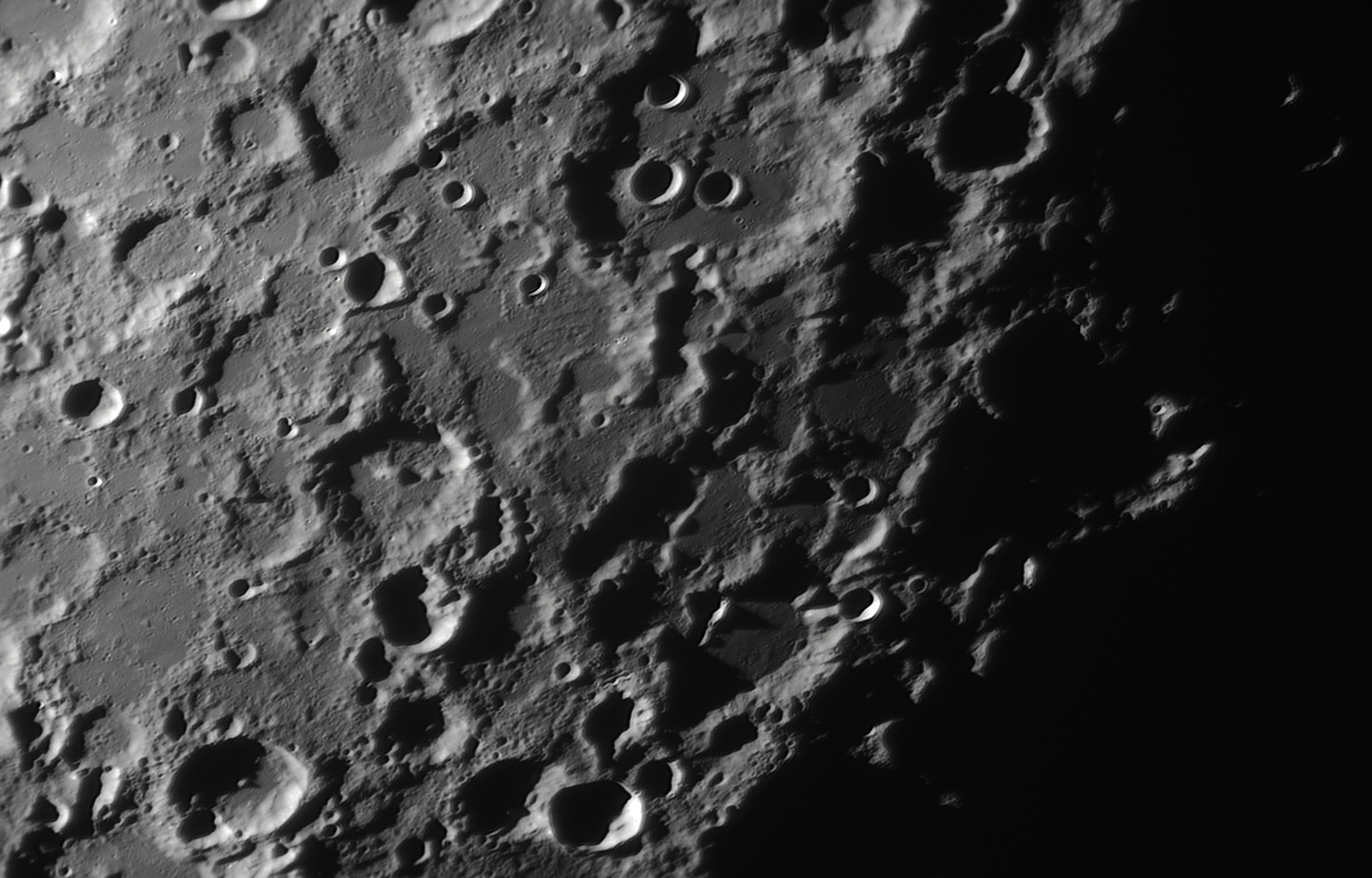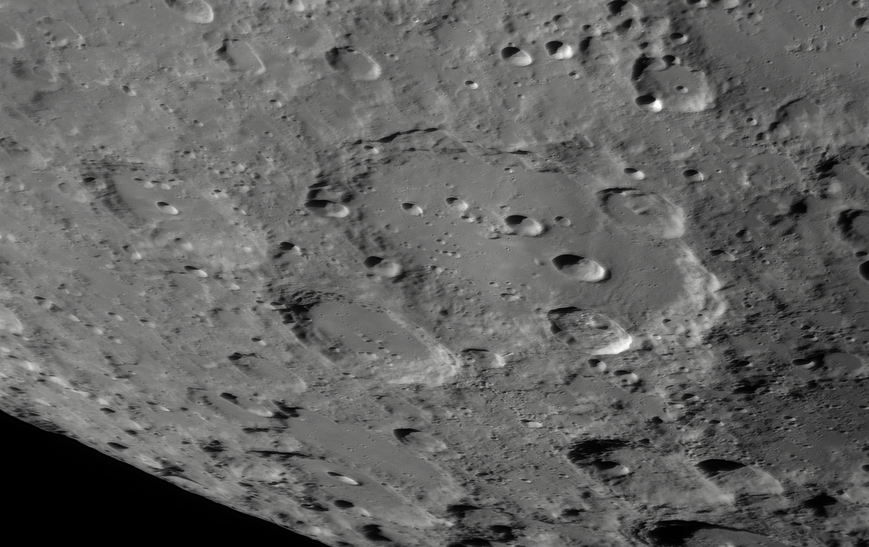 Hansteen and Billy craters area. A pair of similar sized craters, at around 45 kilometers in diameter. October 11, 2020. 355mm Newton, ASI290MM, Red filter.