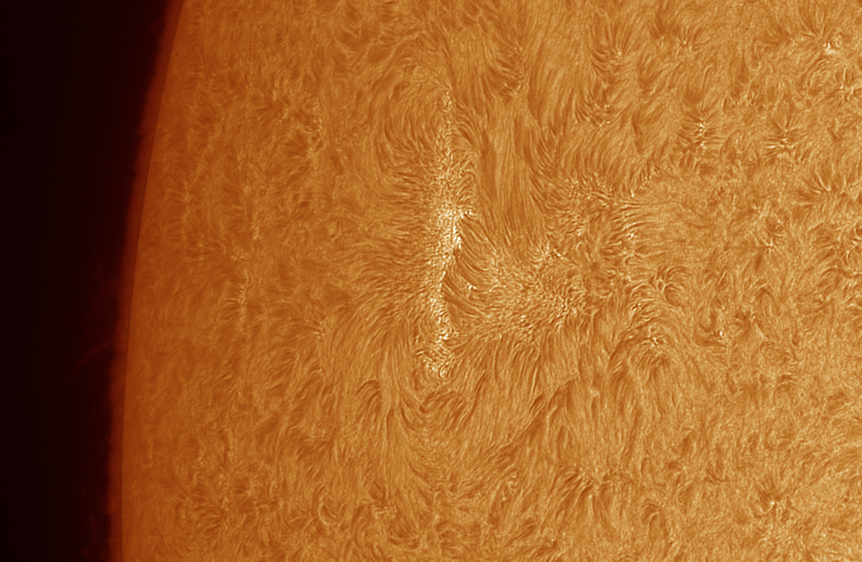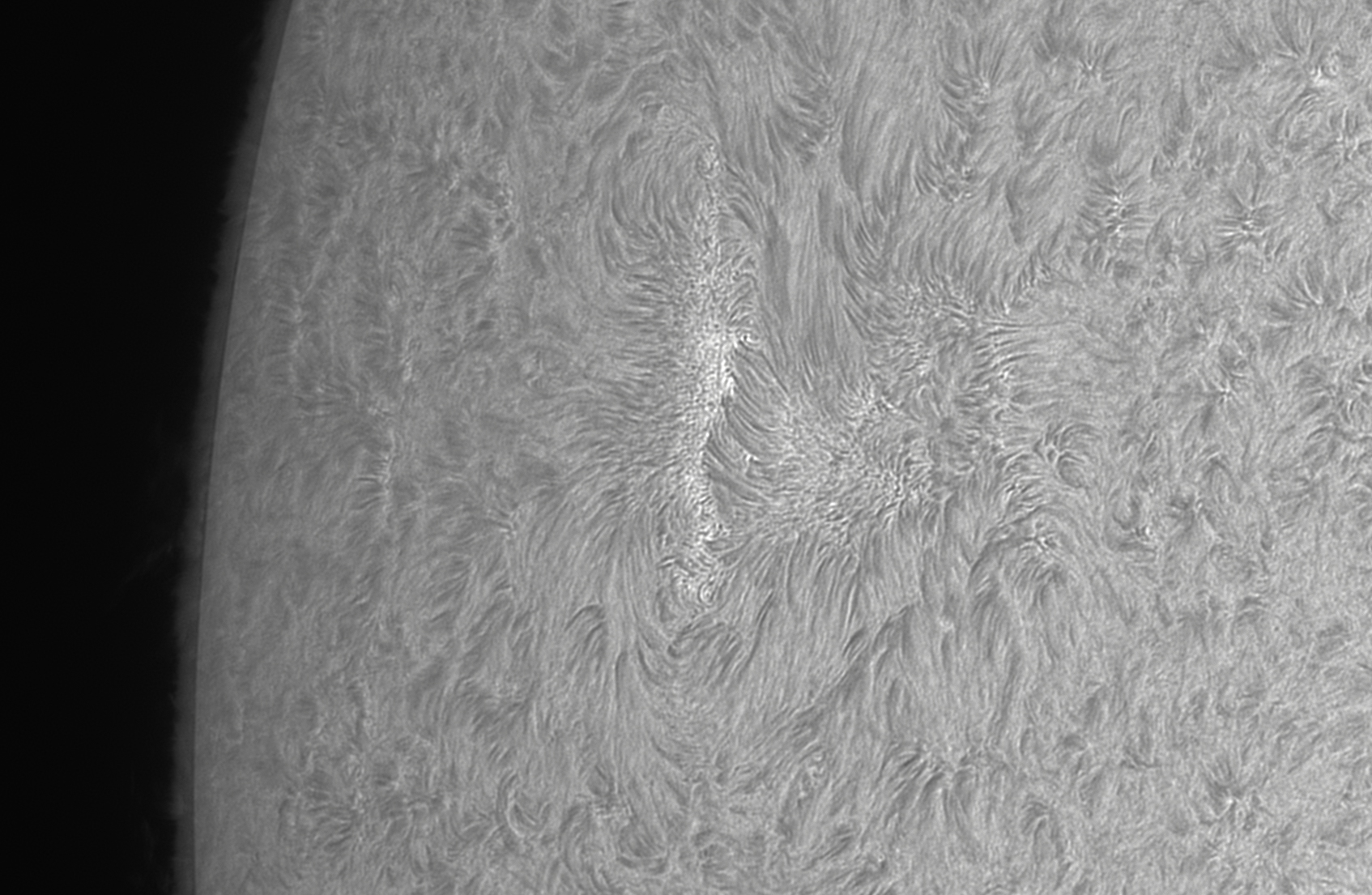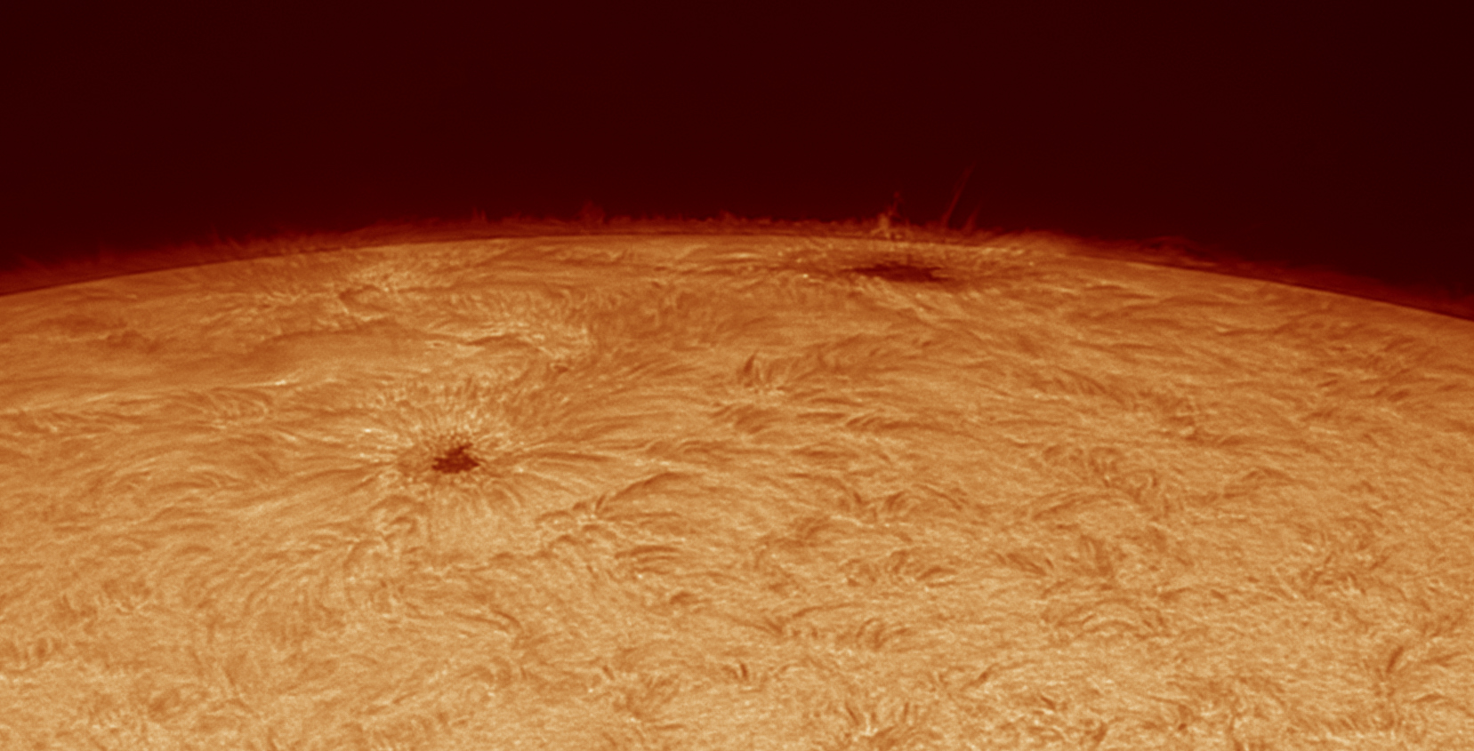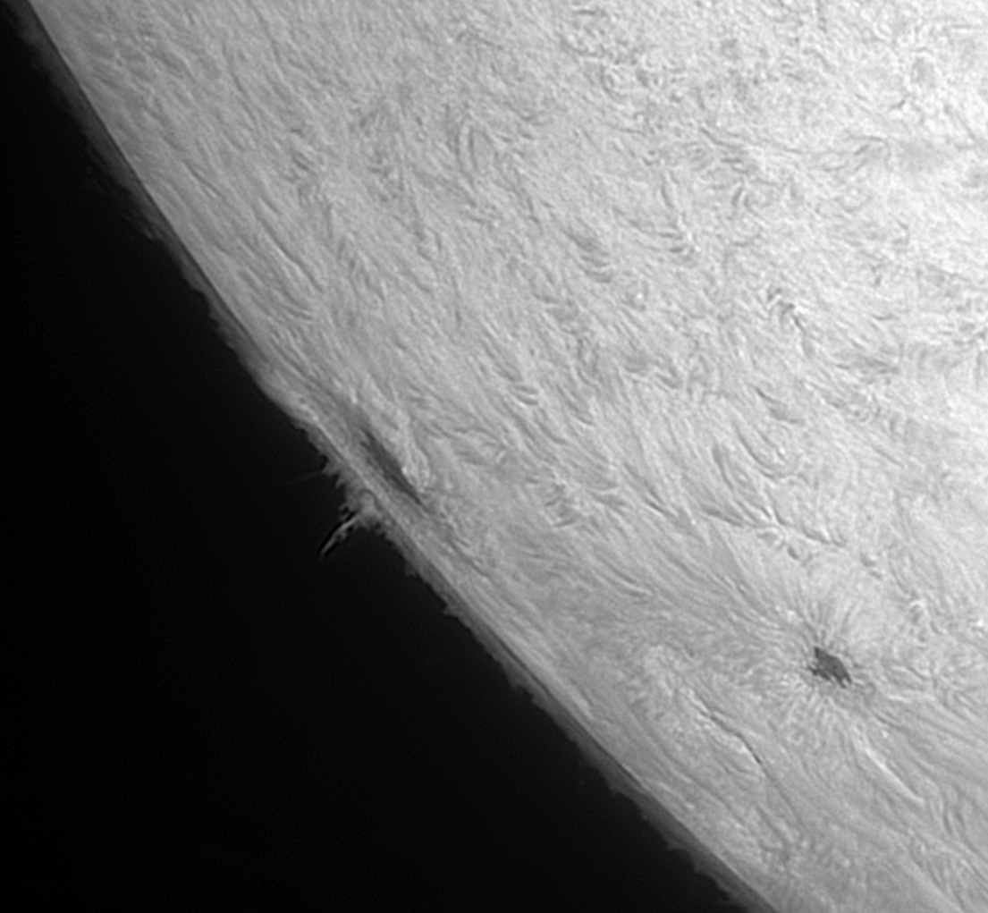 While testing some filters (both H alpha and others), I’ve also acquired a few views of today’s solar features. A few spots, a few proms, and some other details observable in the chromosphere. All shot with the 150mm achromat and Quark filter.