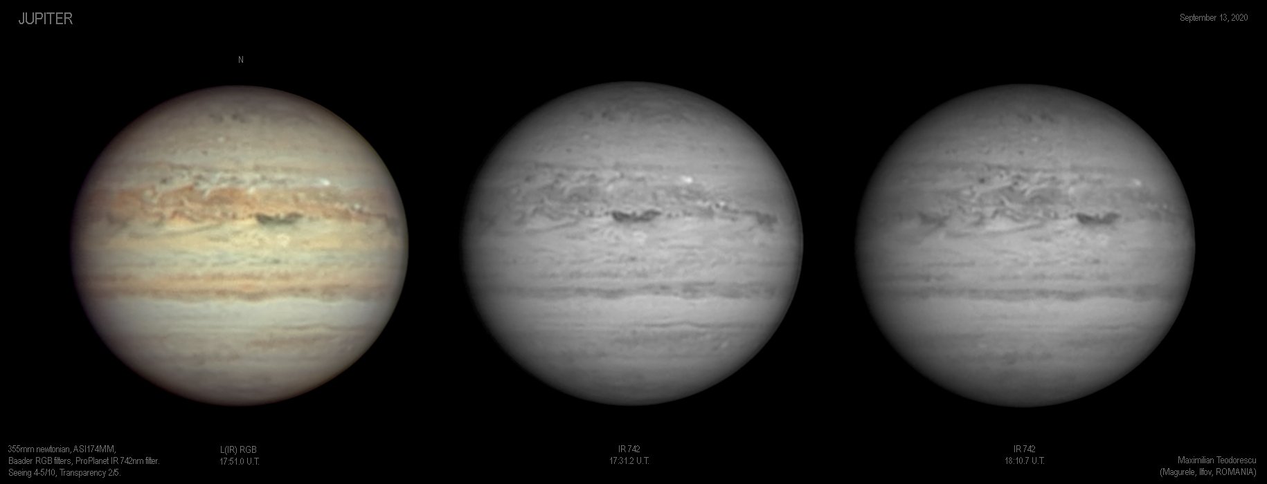 Jupiter images from September 13, 2020, showing the first NTB disturbance effects on the NEB. Poor seeing in the RGB data, so I had to mix it with the IR. The low altitude of the planet is not helping me much…