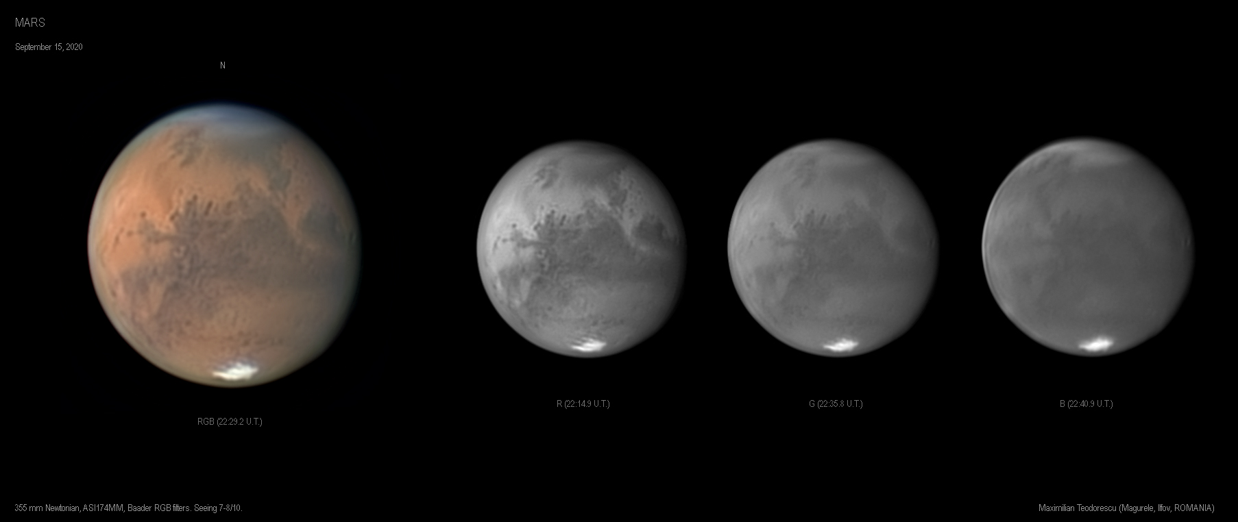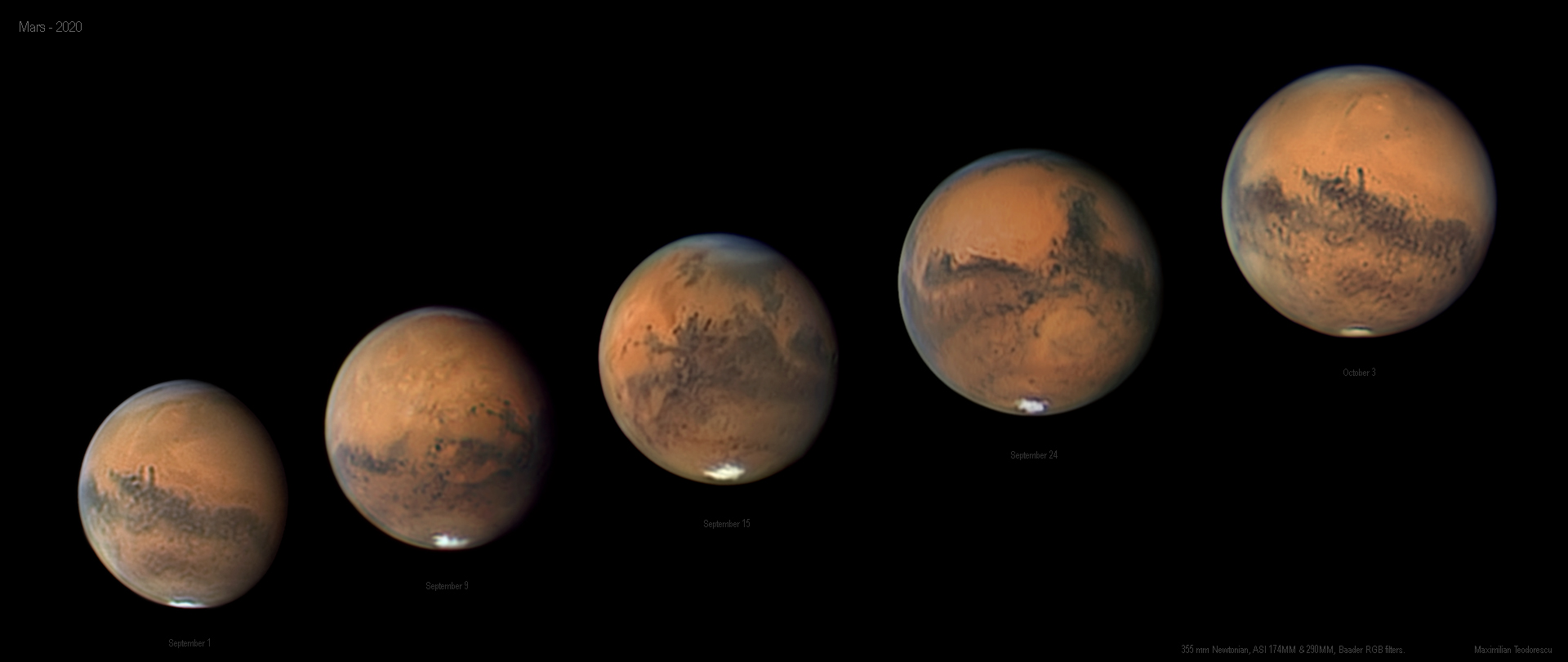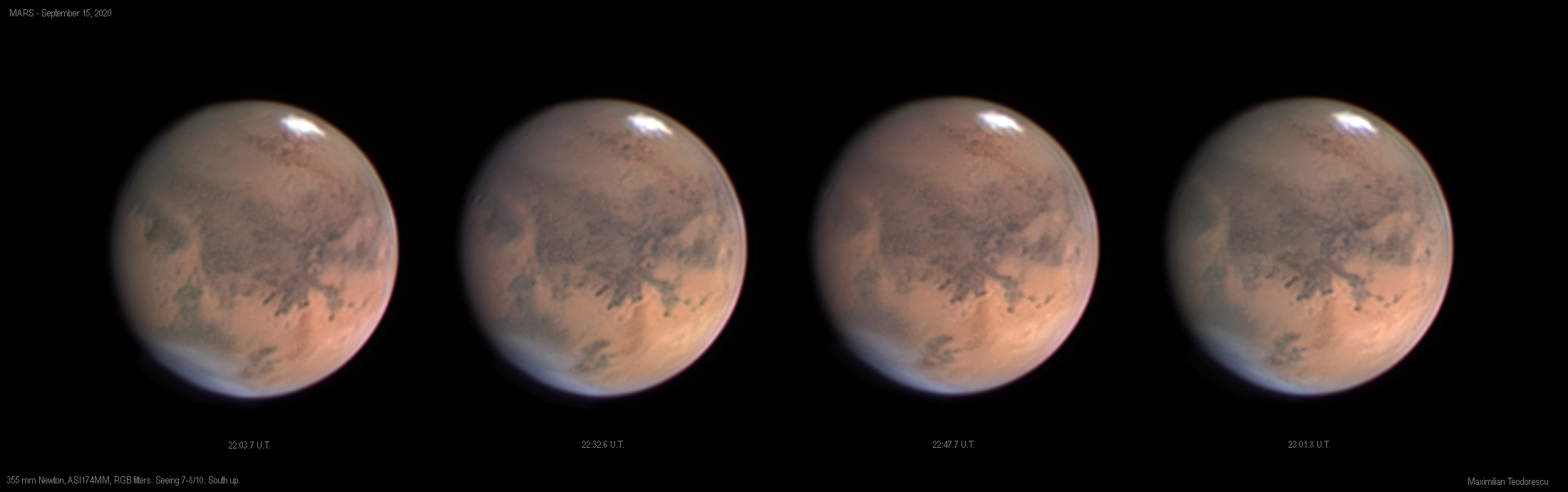 Mars on September 9, 2020, from high up in the mountains, near Piatra Arsa Peak. Some very good to excellent moments of seeing, but mostly fair to good.