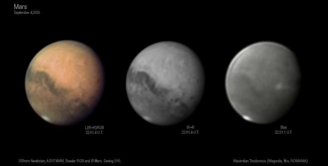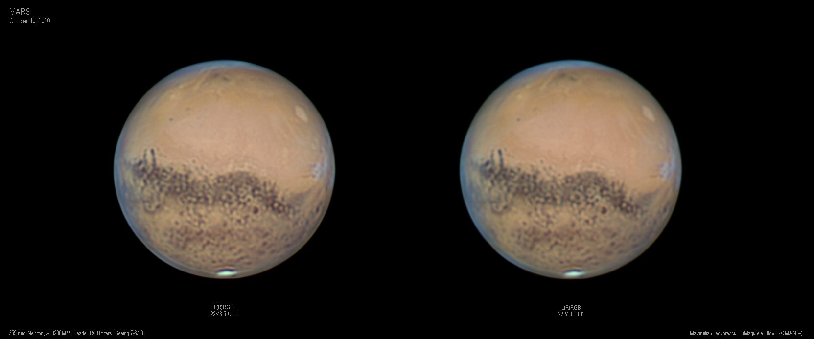 Mars under fair seeing conditions on September 22, 2020. Note the clouds at the terminator in the B image.