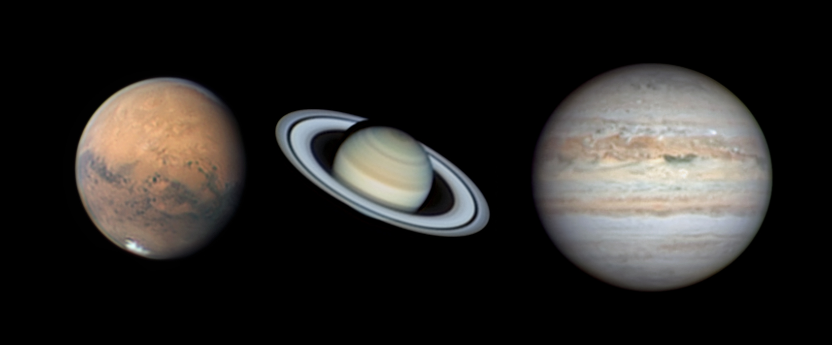 The three planets of August 21, 2020, not to scale (Mars should be almost two times smaller):