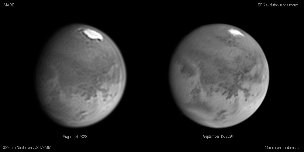 One month of evolution of the martian South Polar Cap (SPC). I’m presenting both images of Mars at the same scale to better grasp the shrinking of the SPC.