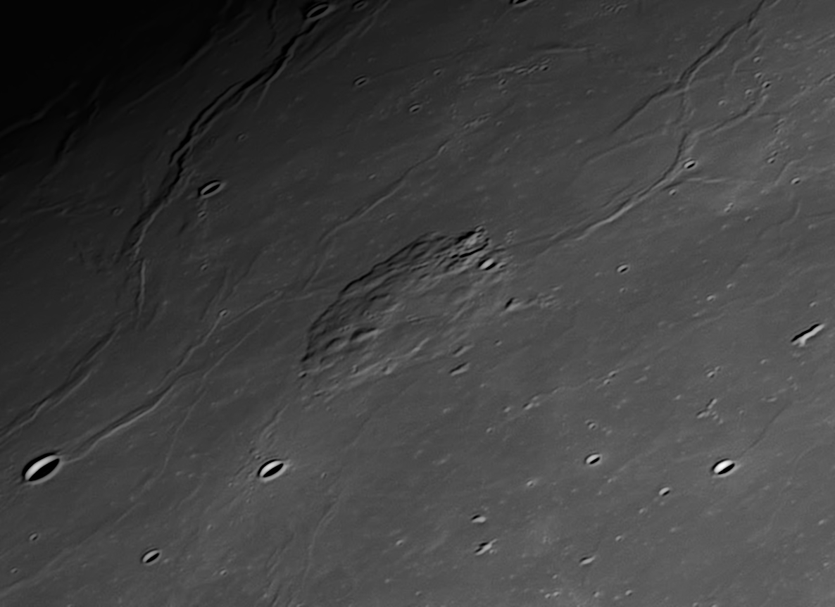 The volcanic complex Mons RΓΌmker and the large partial rim crater Sinus Iridum. Acquired on October 29, 2020 in good seeing but very poor transparency. 355mm Newton, ASI174MM, Red filter. Below is an detail from the above showing only Mons RΓΌmker.
