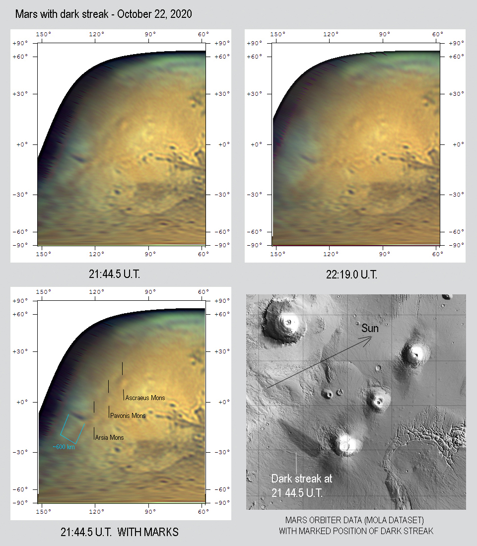 First, using Winjupos, two maps were generated, and the streak’s length was measured at over 600 km. Interestingly, on the Mars Orbiter Map, there are no features that could be accounted for such a dark aspect. Position for 22:19 U.T.: Eastern end: L1=128.5 B=-10.6 , Western end: L1=137.4 B=-5.8.
