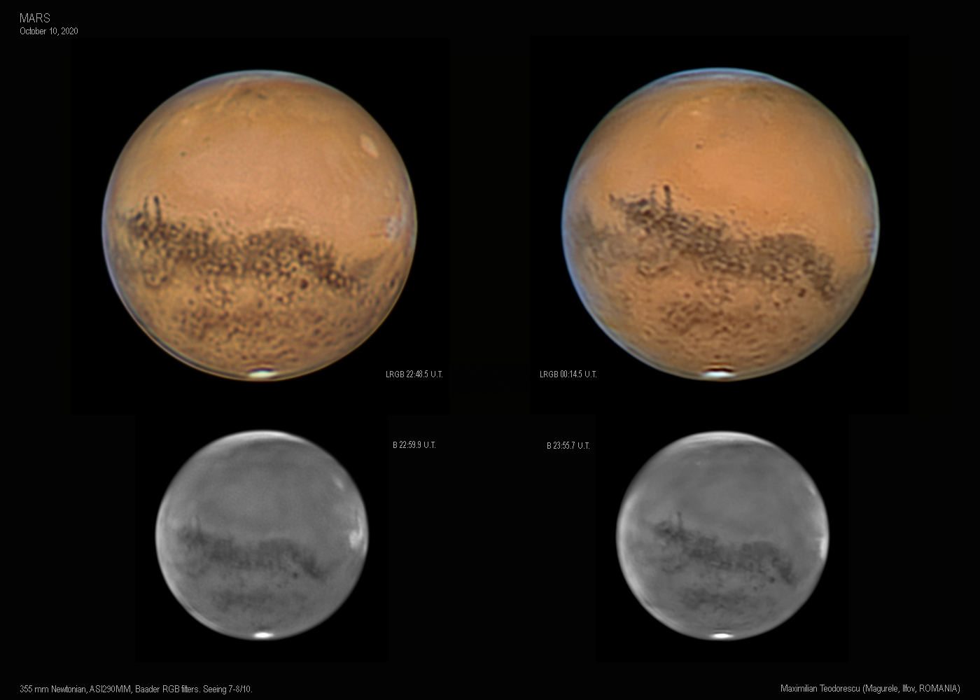 Mars on October 10, 2020: LRGB images and Blue filter images. Note the clouds in the Blue images: a lot of activity compared to just a month ago.